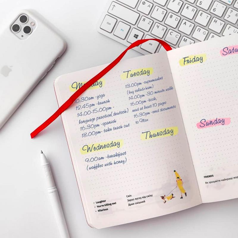 Через одну страничку этого ежедневника - блокнота на английском, в углу ты найдешь 270 слов и фраз на английском с переводом на украинский и классной тематической иллюстрацией.