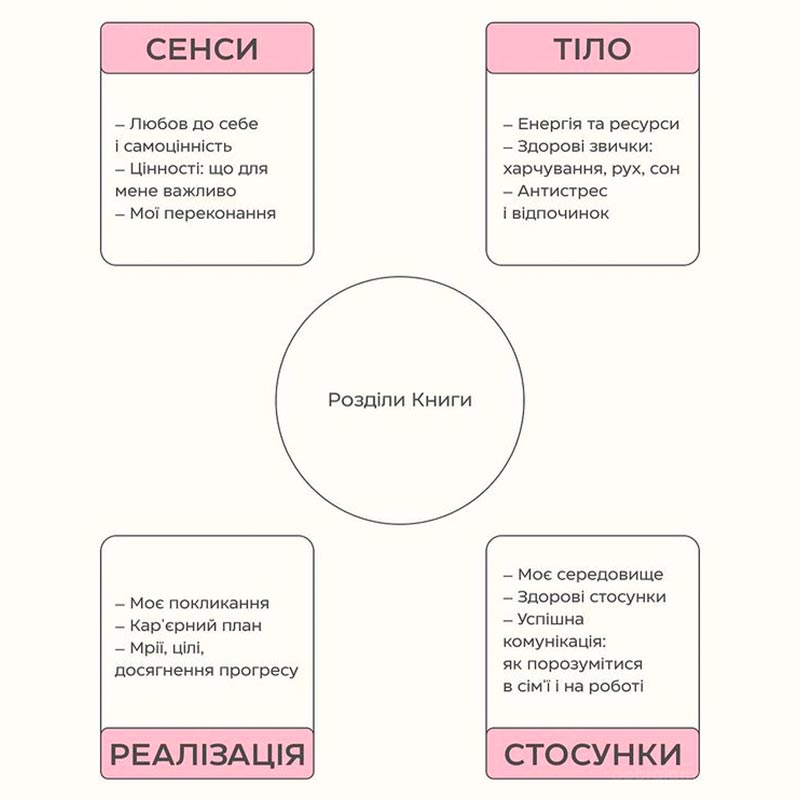 12 разделов, охватывающих 4 сферы: тело, реализация, смыслы, отношения.