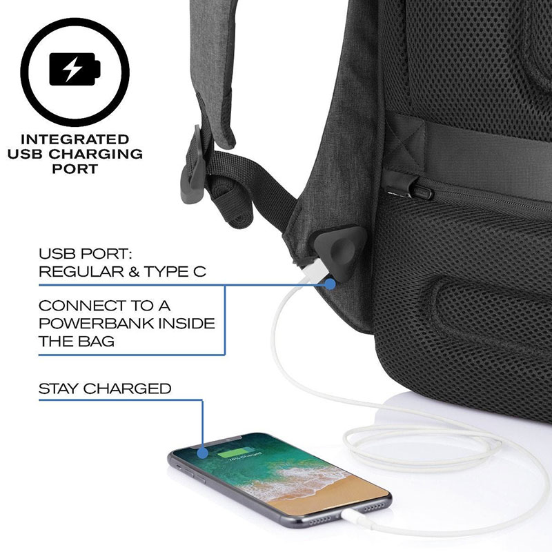XD Design Bobby Pro - обновленная модель всемирно известного рюкзака которая сохранила все свои преимущества, а именно непрорезаемые материалы, скрытые молнии и тайные карманы, интегрированный порт USB для зарядки, сбалансированный вес, водоотталкивающая ткань, светоотражающие полосы безопасности и ремень для крепления на чемодан.