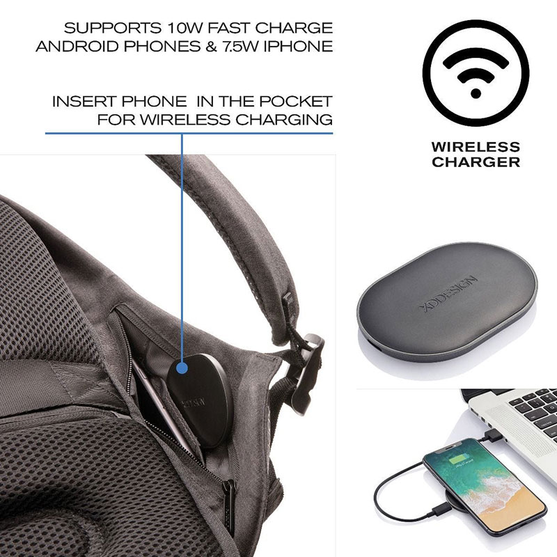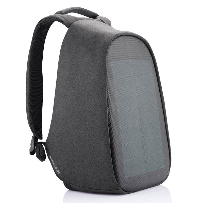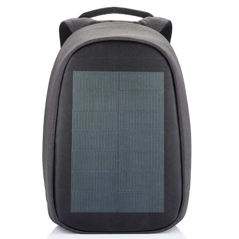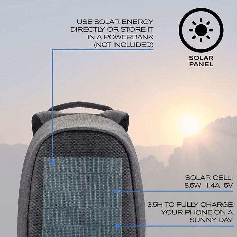На задней части корпуса рюкзака расположена солнечная батарея, Ваш смартфон даже в пасмурную погоду будет всегда заряжен энергией, которая конвертируется встроенной солнечной панелью. Всегда заряженный powerbank станет неиссякаемым источником энергии для гаджетов. Наличие солнечных элементов и модуля беспроводной зарядки – главные технологические фишки модели Bobby Tech.