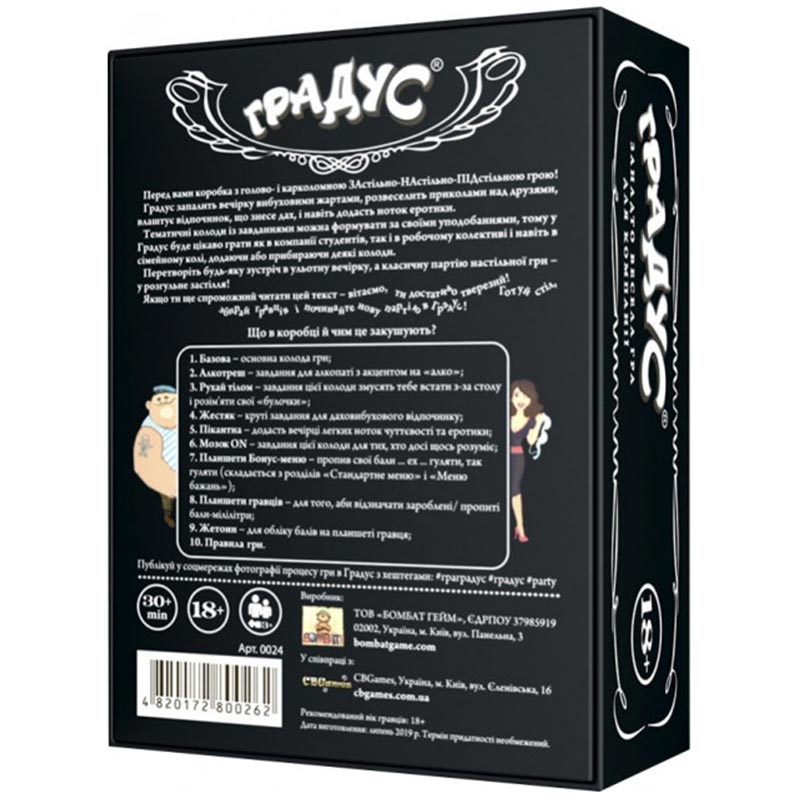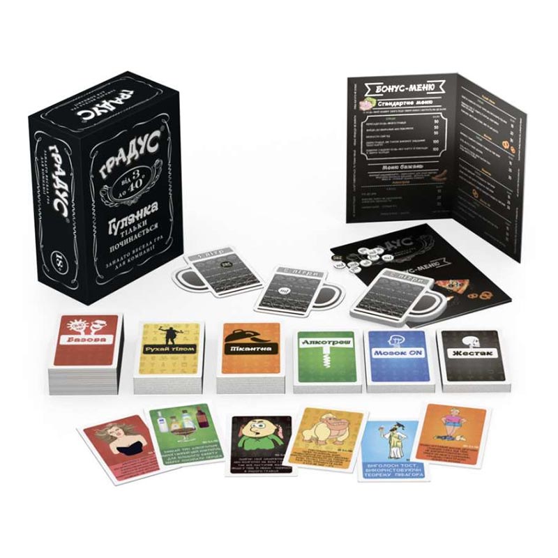 Основное правило, которого следует придерживаться во время всего игрового процесса – выполняйте задания, выпивайте и закусывайте и не забудьте в удобный момент шутить над другими игроками. В игре могут принимать участие от 3-х до 12-ти игроков, и чем больше вы соберёте компанию, тем будет веселее. В небольшой компактной коробочке вас ждёт 6 тематических колод карт: базовая, пикантная, алкотреш, жестяк, двигай телом, мозг ON, 12 индивидуальных планшетов для каждого игрока и жетоны, а также 2 планшета со стандартным меню и меню желаний.