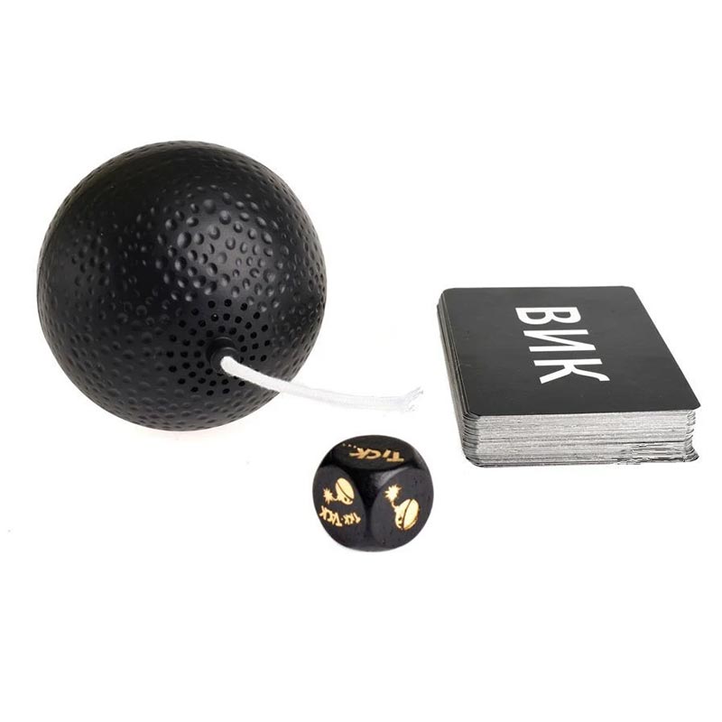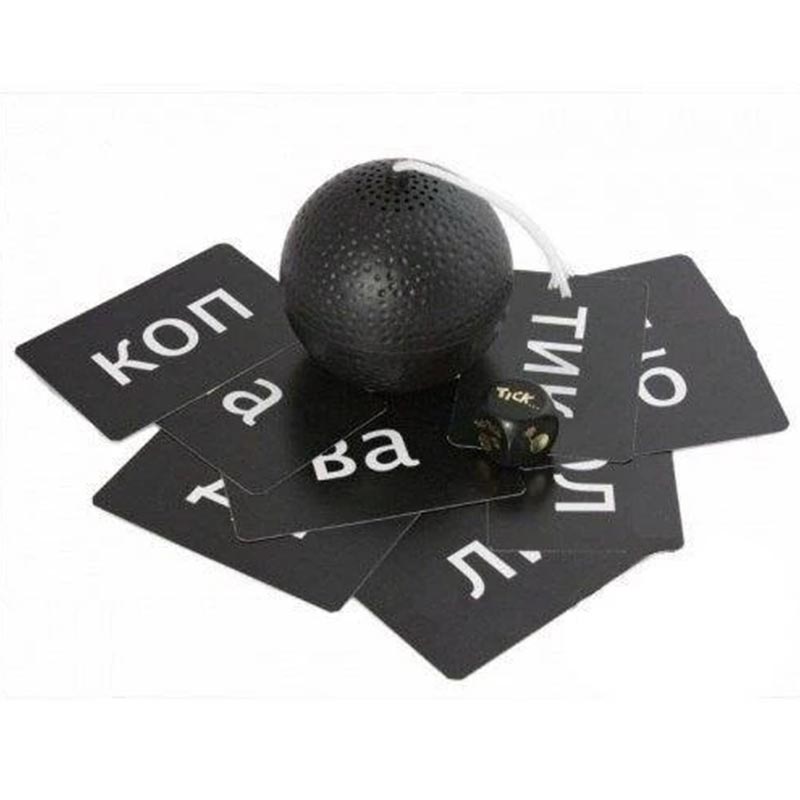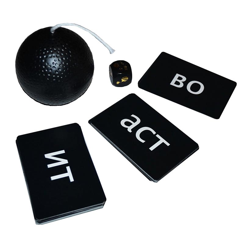 Задача настольной игры Тик так Бумм очень проста – придумать слова с заранее заданным набором букв. Принцип довольно простой: у вас есть бомба, карточка со слогом и кубик. Бомба нужна для того, чтобы быстрее думать, карточка со слогом, чтобы вы знали, с какими буквами надо составлять слова, кубик, чтобы вы ориентировались, где можно или нельзя использовать данный слог.