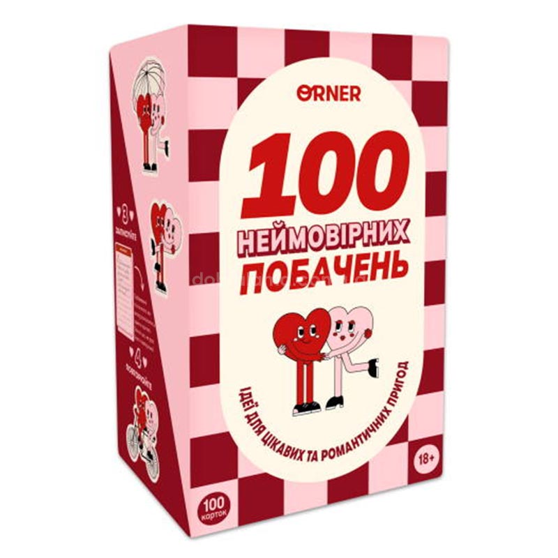 100 невероятных свиданий (укр.) — это настольная игра, которая поможет оживить отношения, наполнить их новыми впечатлениями и создать воспоминания, которые останутся с вами навсегда. Это настоящая сокровищница идей, которые превратят каждый вечер в маленькое приключение. Всего одна коробочка — и перед вами открываются сотни возможностей для весёлых приключений, романтики и неожиданных открытий.