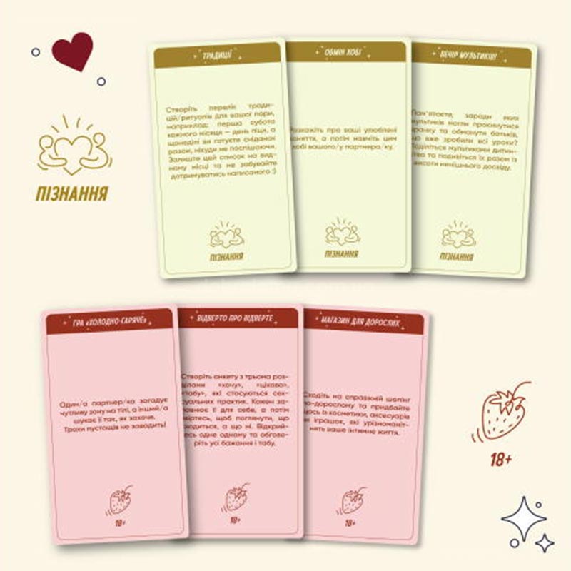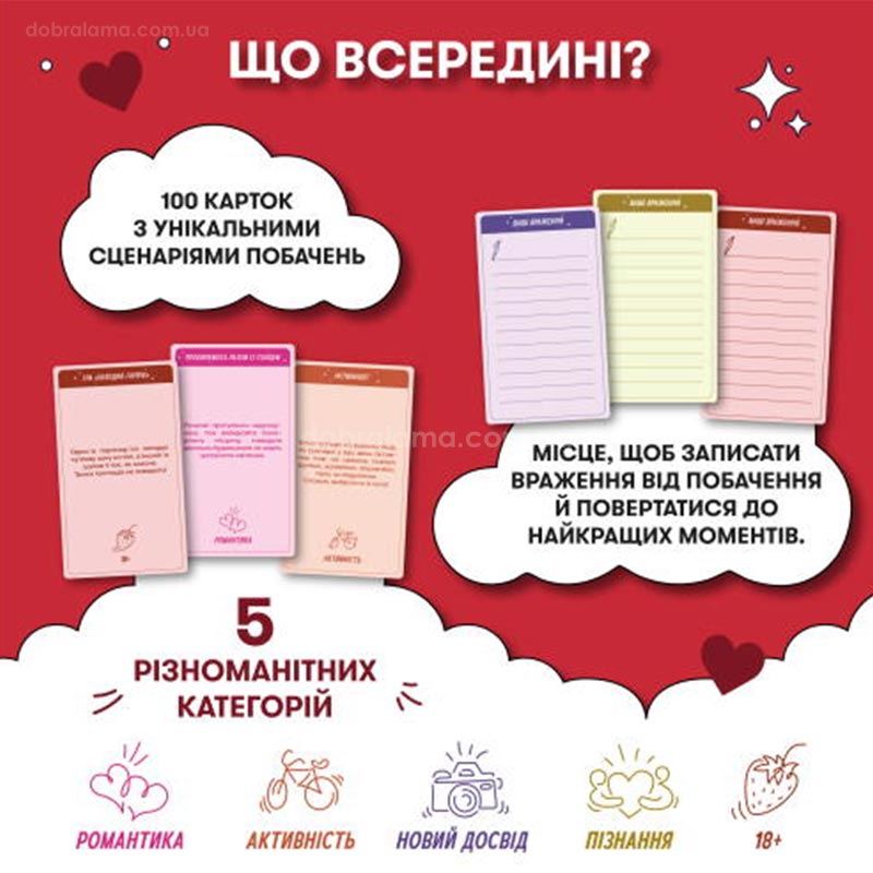В коробке вас ждут 100 карточек с необычными сценариями свиданий. Они разделены на пять категорий, каждая из которых предлагает особый формат совместного времяпрепровождения: