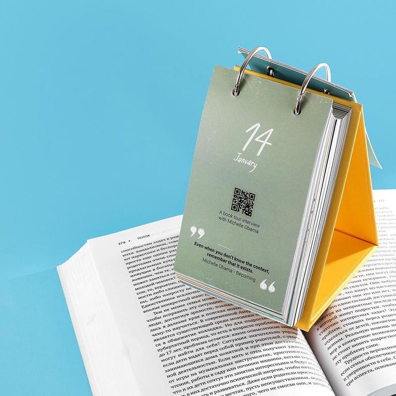 В этом перекидном календаре вы найдете цитаты классиков и наших современников о жизни, отношениях, бизнесе, инновациях и идеях. Этот вдохновляющий календарь дает ответы на многие вопросы тем, кто их ищет. Это отличный инструмент не только для саморазвития, но и для практики английского. На каждой 7-й странице расположен QR-код с ссылкой на мотивирующее видео на английском языке – о тайм-менеджменте, вдохновении, внутреннем ресурсе, о том как рождаются креативные идеи и множестве других актуальных тем.