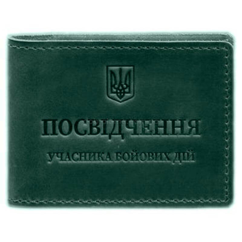 Тиснение на лицевой стороне обложки выполнено горячим методом, который формирует четкий оттиск. Вверху расположен герб Украины, посередине находится надпись «Посвідчення учасника бойових дій»