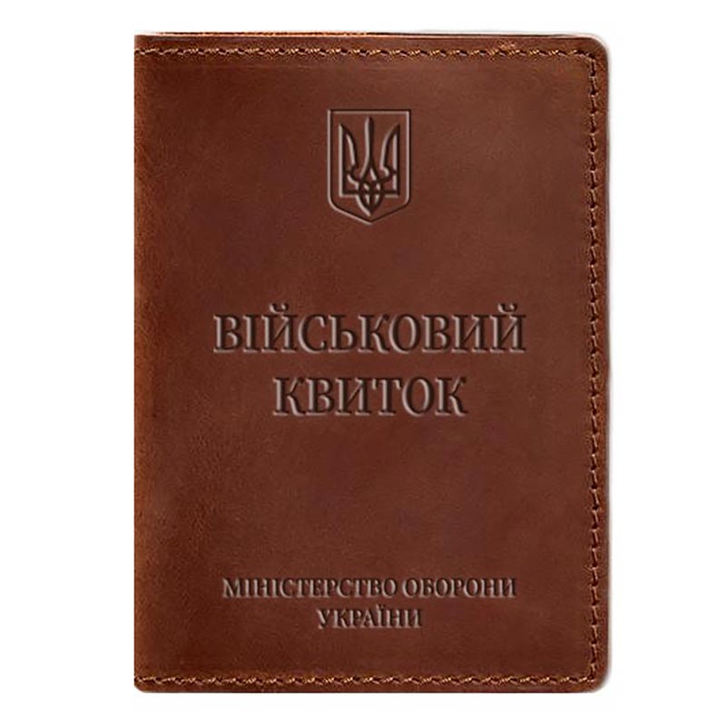 Тиснение на лицевой стороне обложки полностью дублирует оригинальный бланк документа. Вверху расположен герб Украины, посередине находится надпись «Військовий квиток» и в нижней части имеется тиснение "Міністерство оборони України"