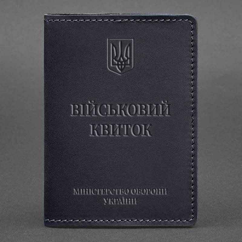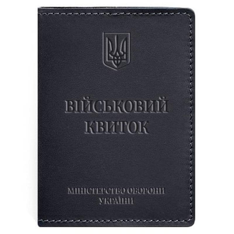 Тиснение на лицевой стороне обложки полностью дублирует оригинальный бланк документа. Вверху расположен герб Украины, посередине находится надпись «Військовий квиток» и в нижней части имеется тиснение "Міністерство оборони України"