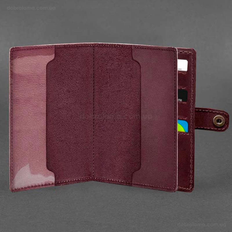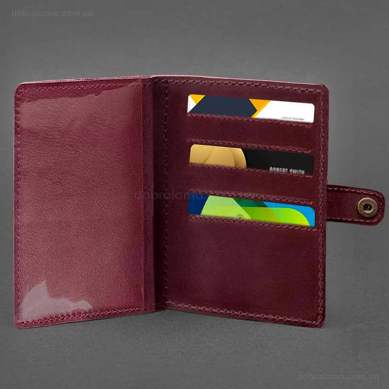 Внутри имеется 1 отделение для купюр, 5 слотов для пластиковых карт, отделение с прозрачным карманом и отделение для документа.