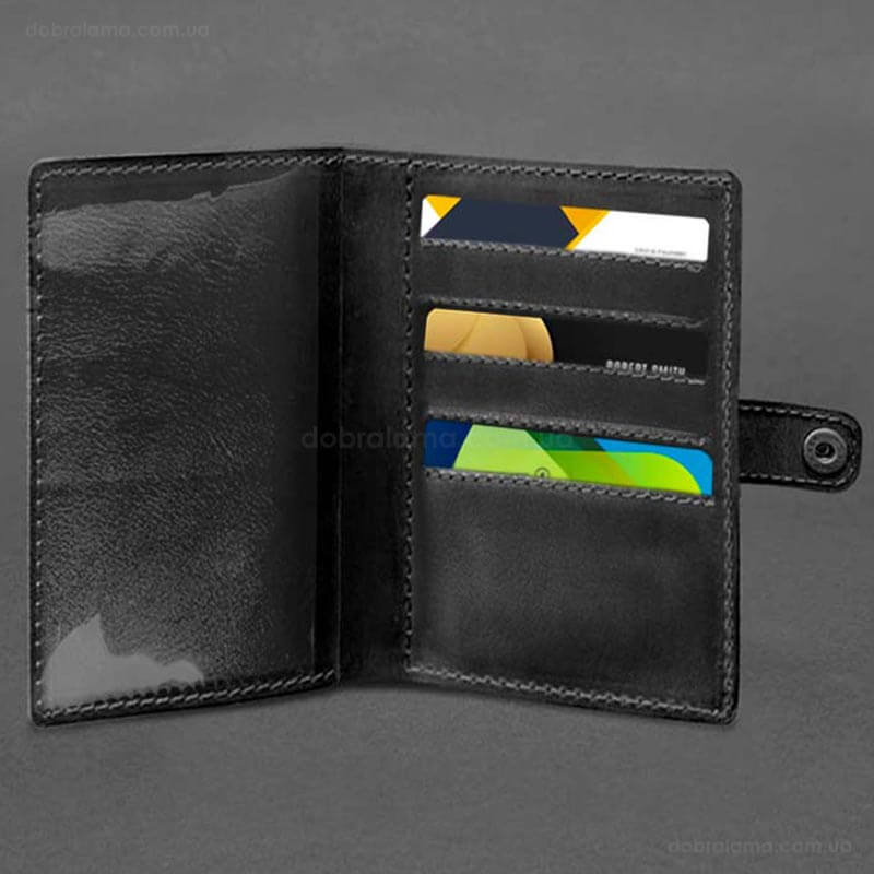 Внутри имеется 1 отделение для купюр, 5 слотов для пластиковых карт, отделение с прозрачным карманом и отделение для документа.