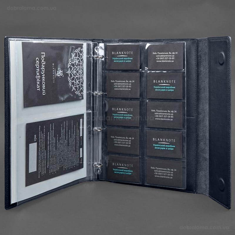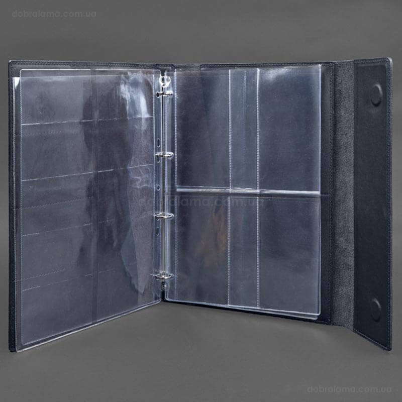 - 1 файл с 10-ю карманами для документов карточного типа (ID паспорт, банковские карты, визитки). Размер карманов – 94х59 мм