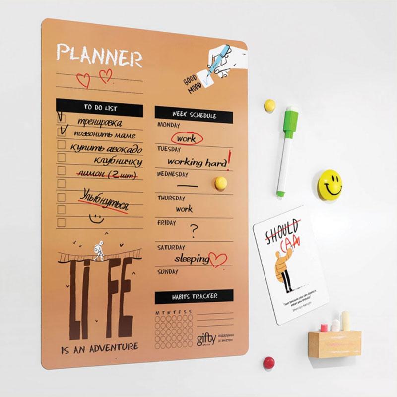 От обычного ежедневника из бумаги этот планер на магните отличается тем, что все время будет перед глазами. Туда можно писать только свои дела или сделать его семейным. Специальные маркеры со стеркой помогут записывать, стирать и снова записывать все новые идеи и задачи. Так что можно купить магнитный планер один раз, а использовать очень-очень долго.