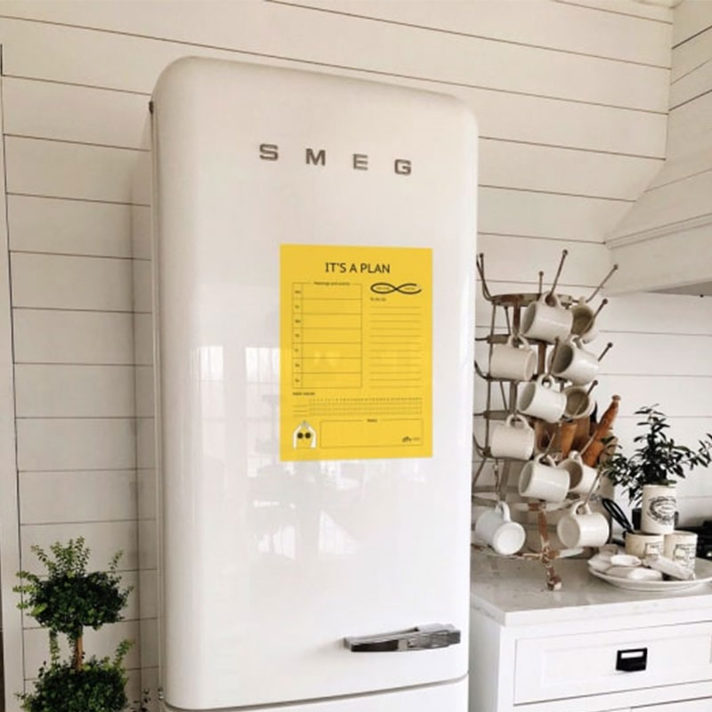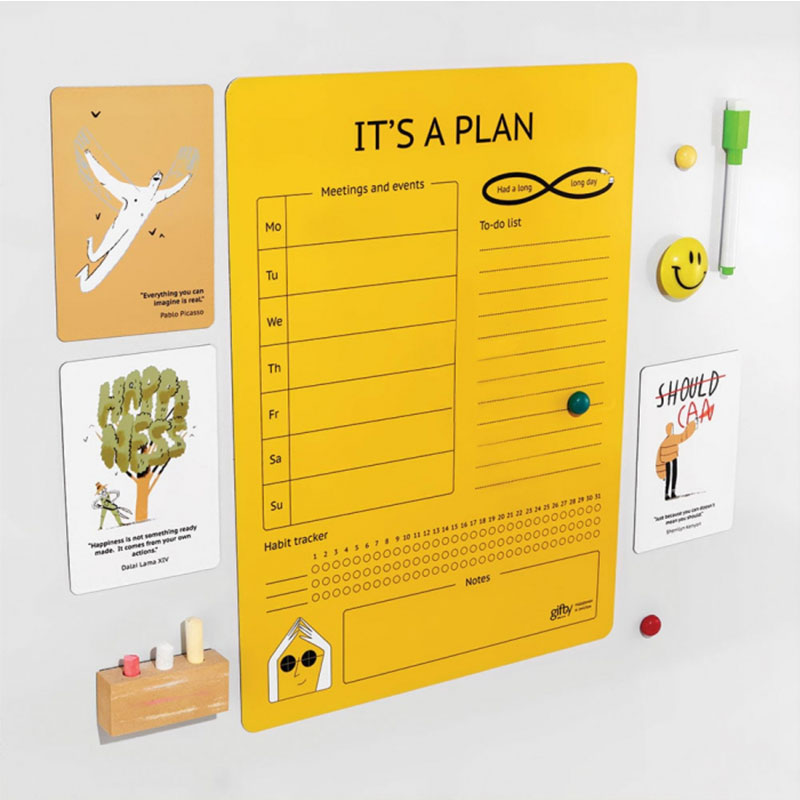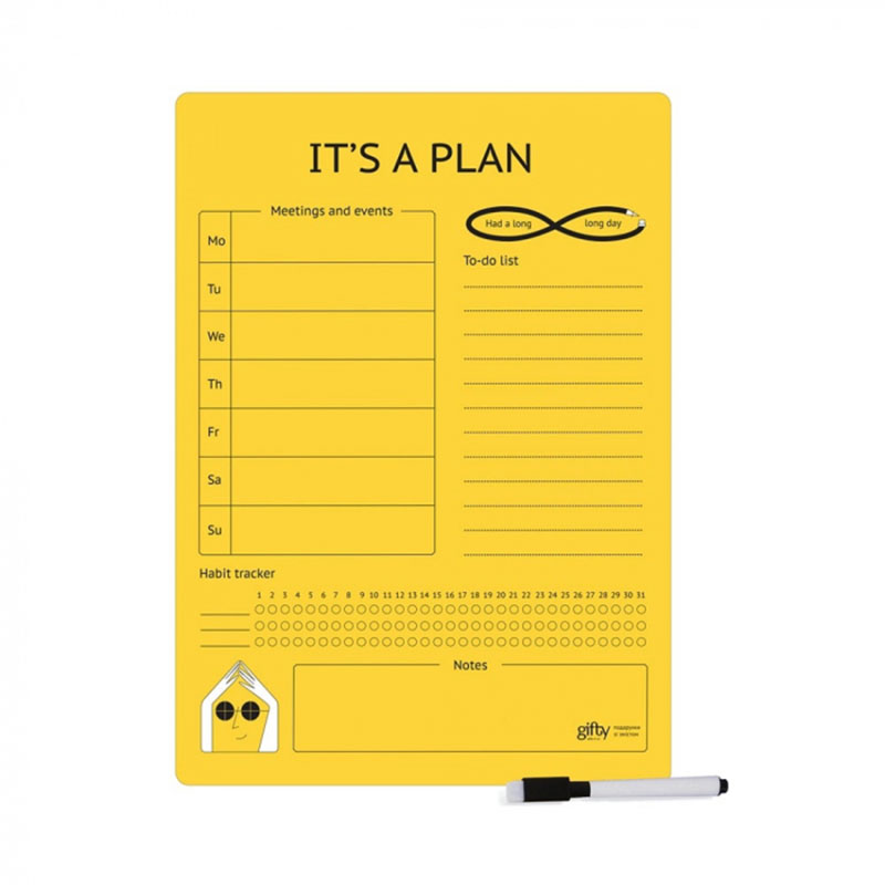 Магнитный планер It's a plan — твой яркий помощник в организации дел. Это гибкий планер большого формата, который можно повесить на холодильник. В комплекте идут маркеры, которыми можно писать планы, задачи и идеи, и губка для стирания. Так что эта вещь будет радовать тебя очень долго.