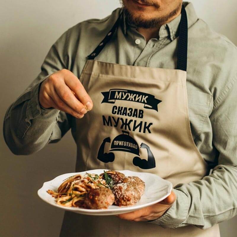 А теперь представьте, как будет выглядеть мужчина у плиты в фартуке. Круто, да? Тогда скорее жмите "купить", а мы позаботимся, чтобы фартушек как можно скорее оказался у самого лучшего мужчины :)