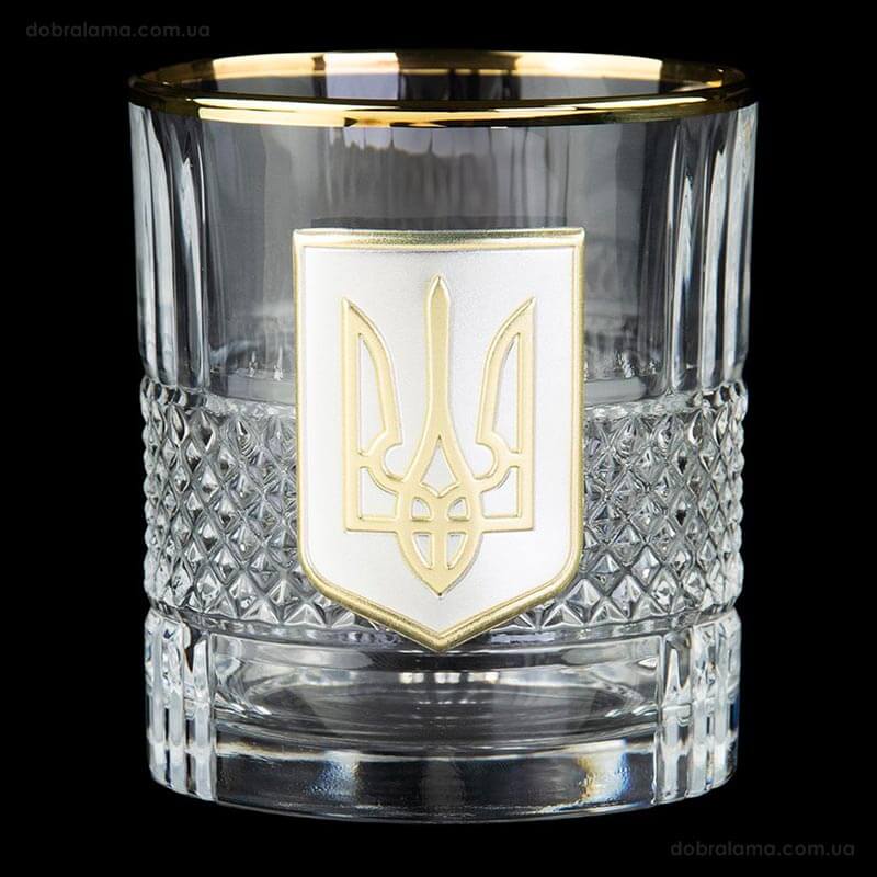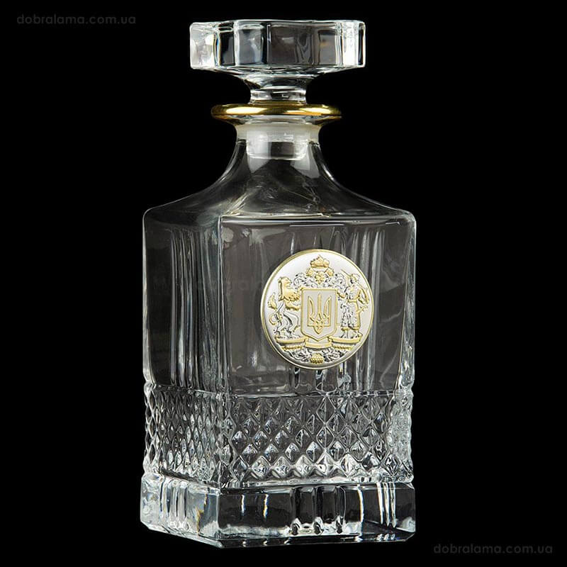 Подарочный набор для виски из 7 предметов: графина и 6 стаканов с серебрянными и золотыми накладками тризуба станет отличным подарком для любителя крепких напитков.