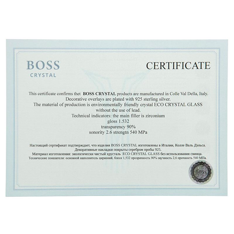 Изделия набора изготовлены вручную из экологически чистого хрусталя, декорированы накладками с покрытием серебра (925 пробы) и золота 24Кт. В производстве хрусталя Boss Crystal используется современная технология без использования оксида свинца, который заменили на цирконий для прочности и звона и на барий для оптической игры света на гранях изделий.