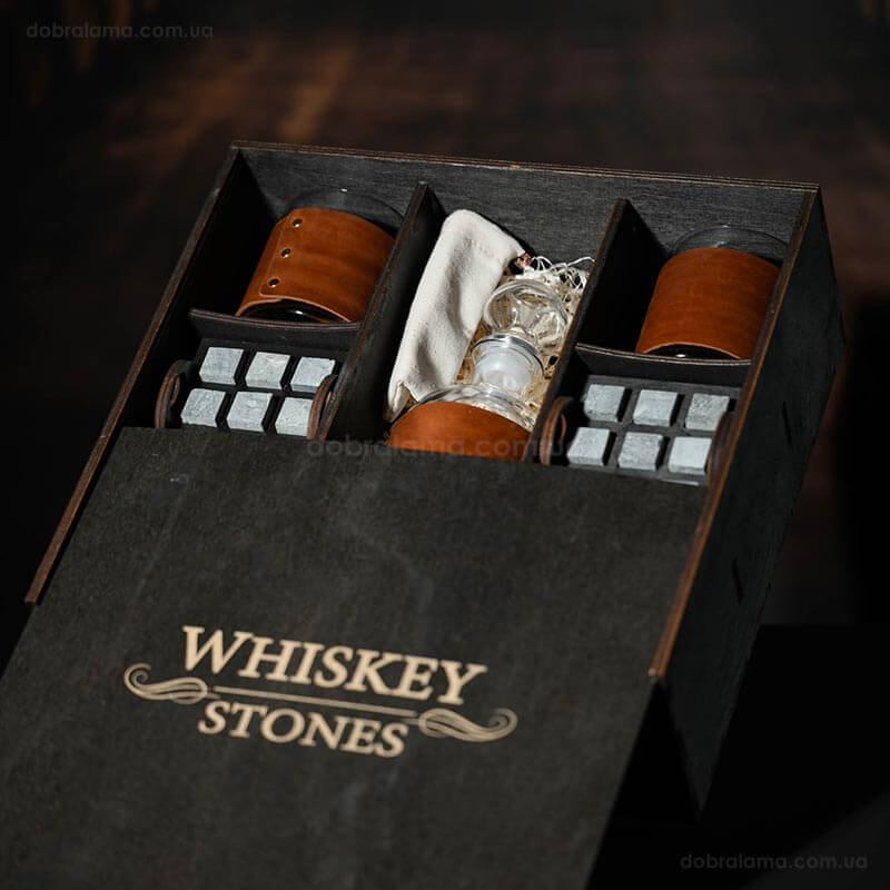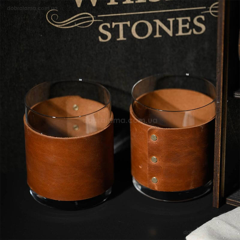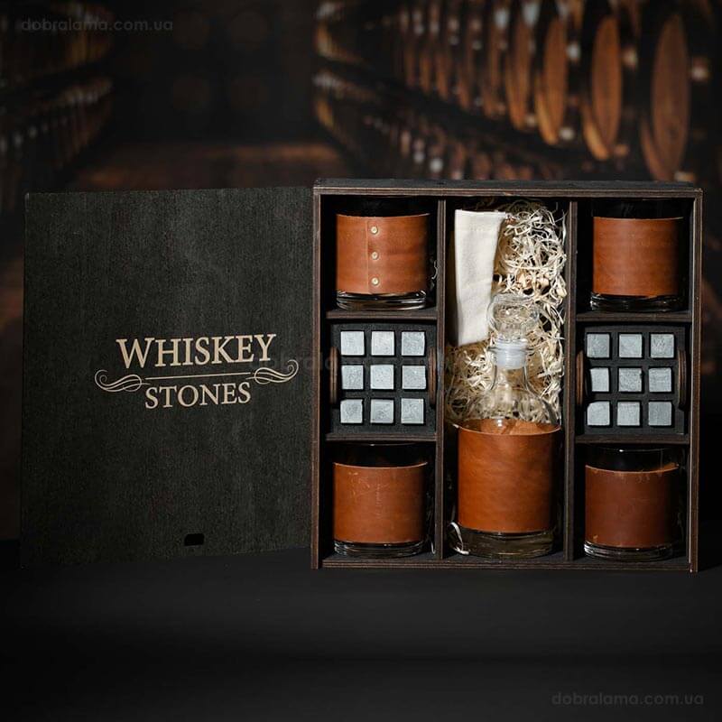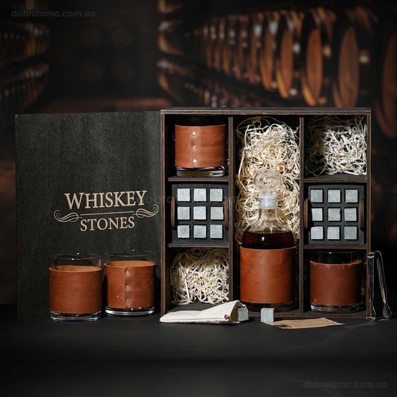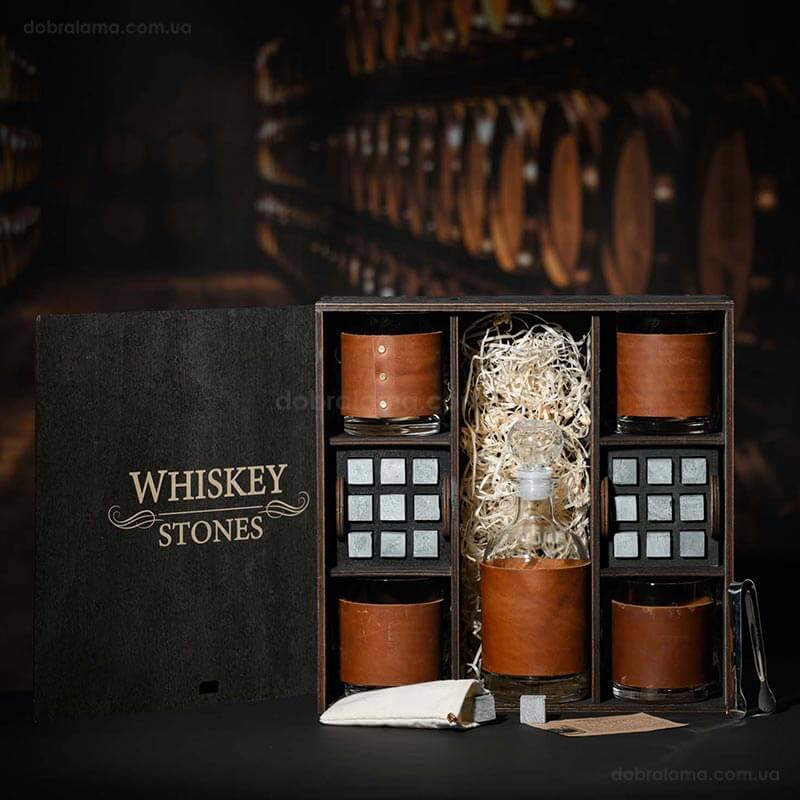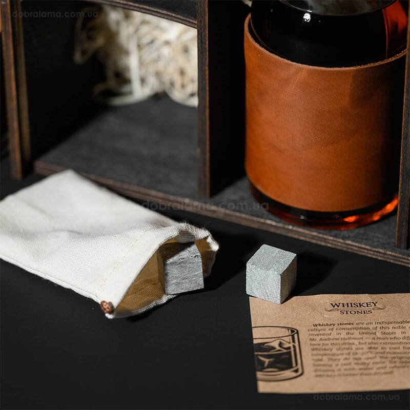 Набор для виски Larus Leather №8 (4 стакана, графин, 18 камней для виски, щипцы, мешочек)