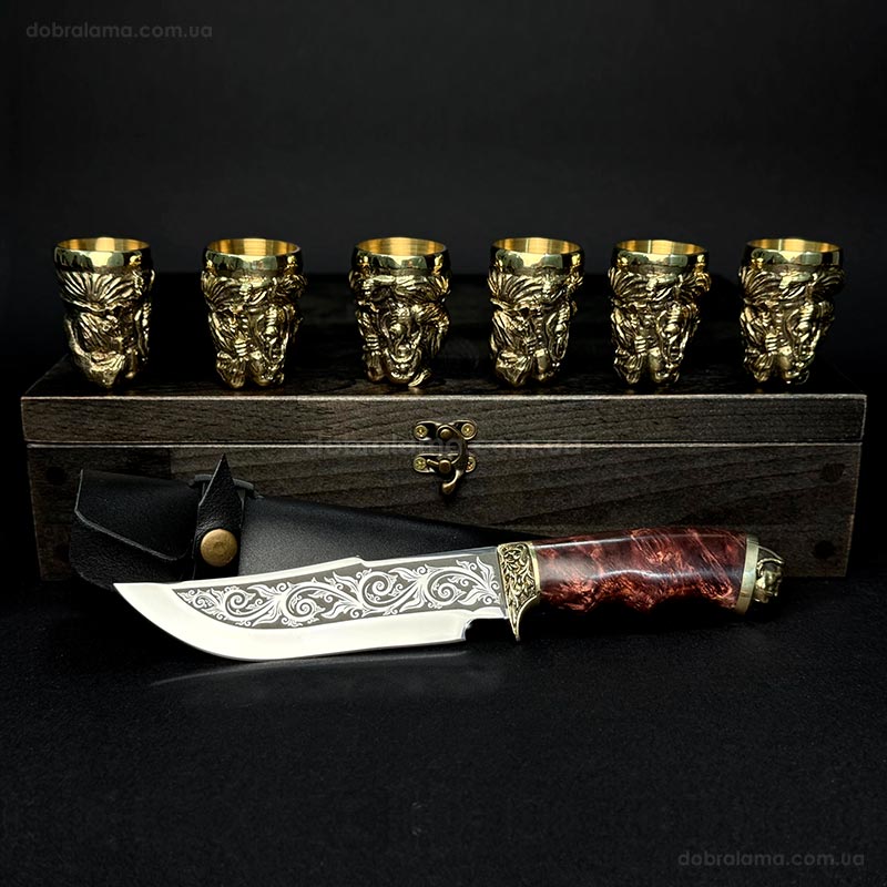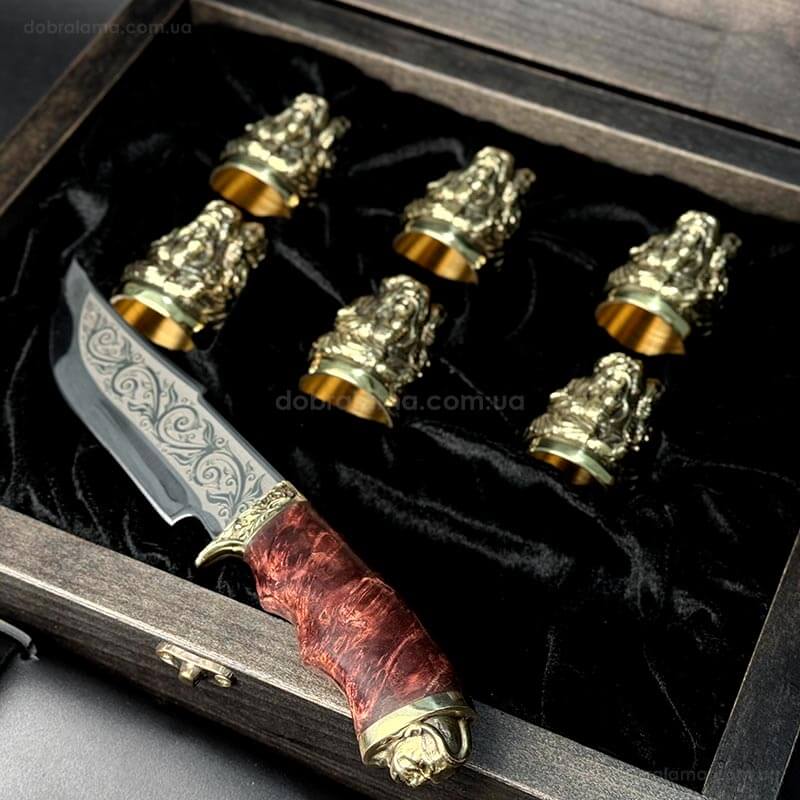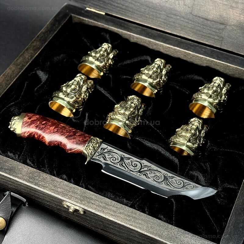 Подарочный набор для мужчин «Козацька рада» (6 бронзовых стопок, нож) в деревянном кейсе