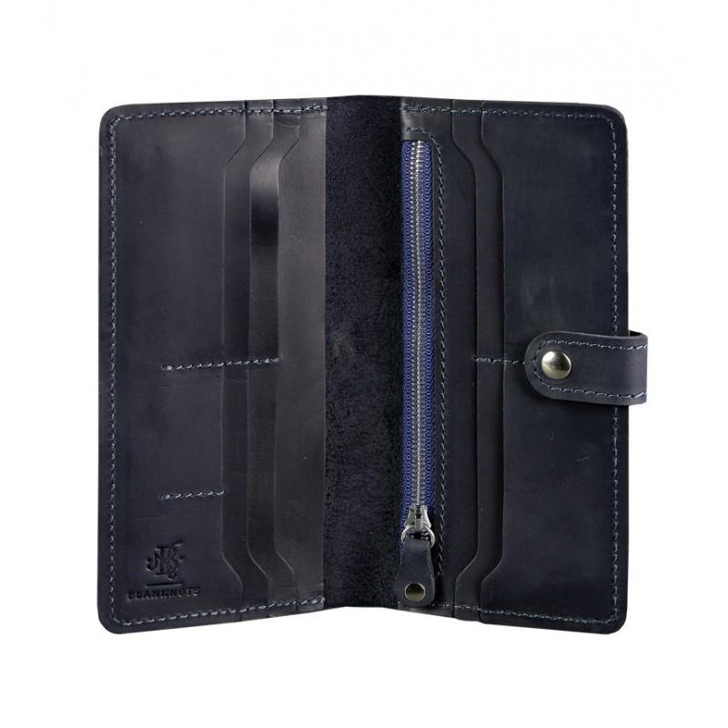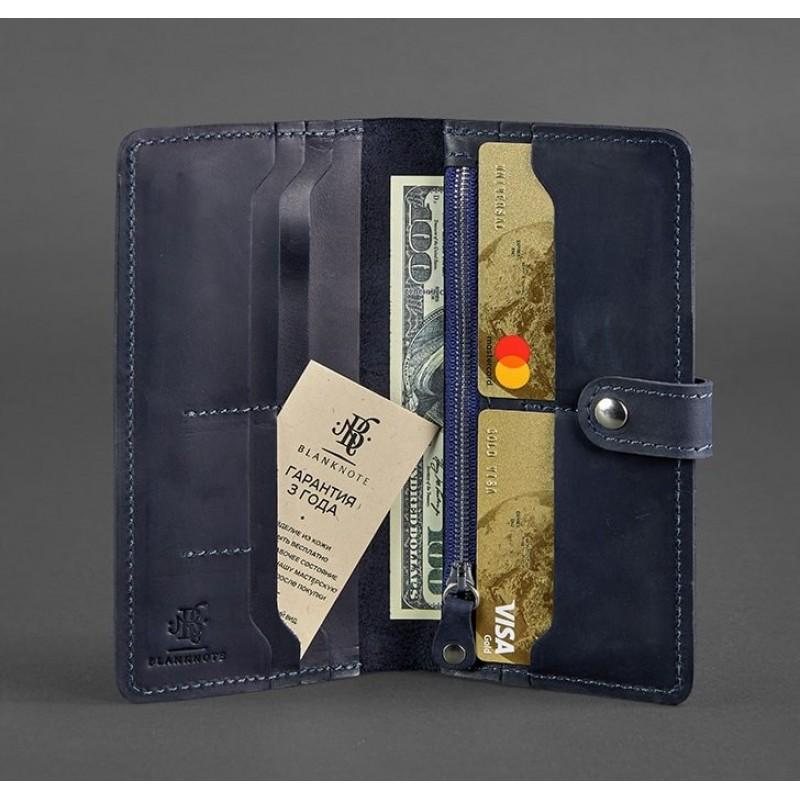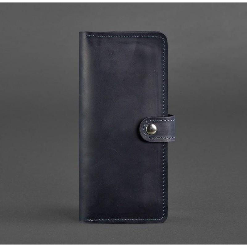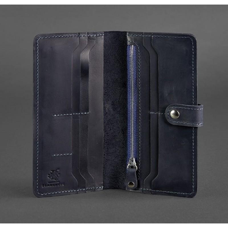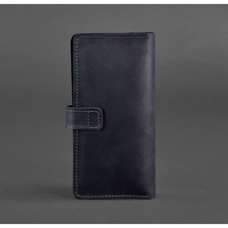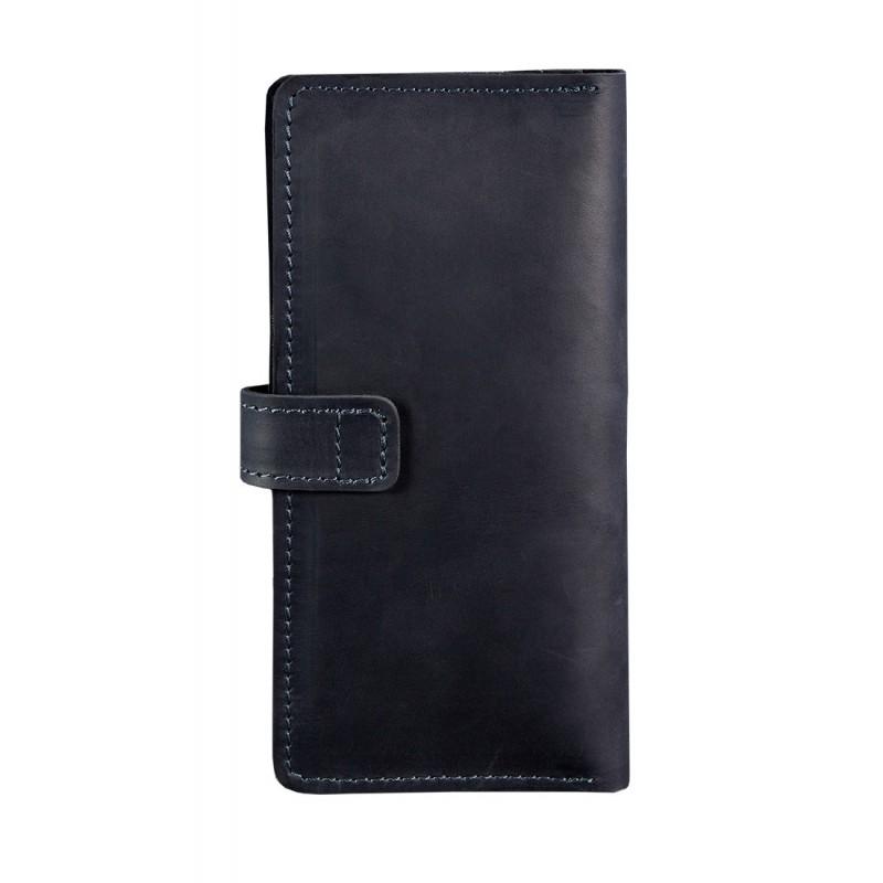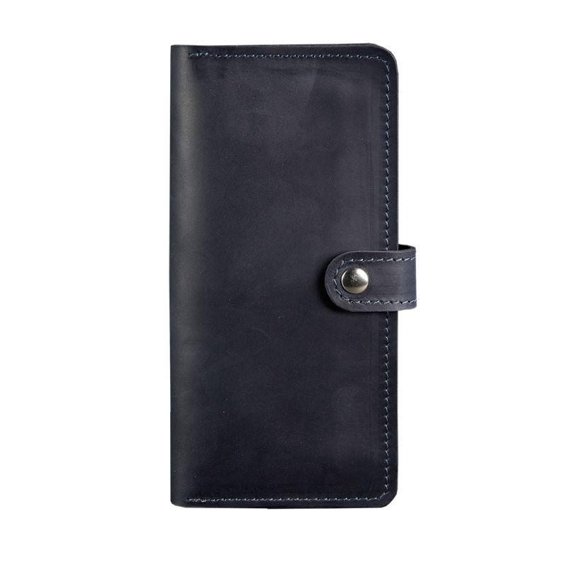 Классическое женское портмоне на кнопке, которое можно использовать как маленький клатч. Темно-синий цвет аксессуара в тандеме с винтажной натуральной кожей позволит легко сочетать портмоне, как с элегантным, так и с повседневным образом.