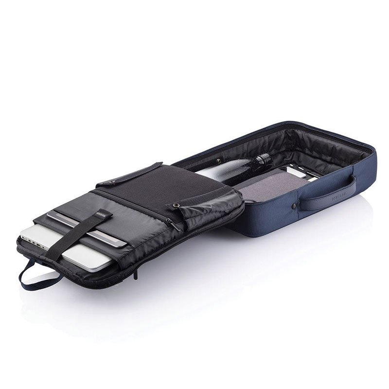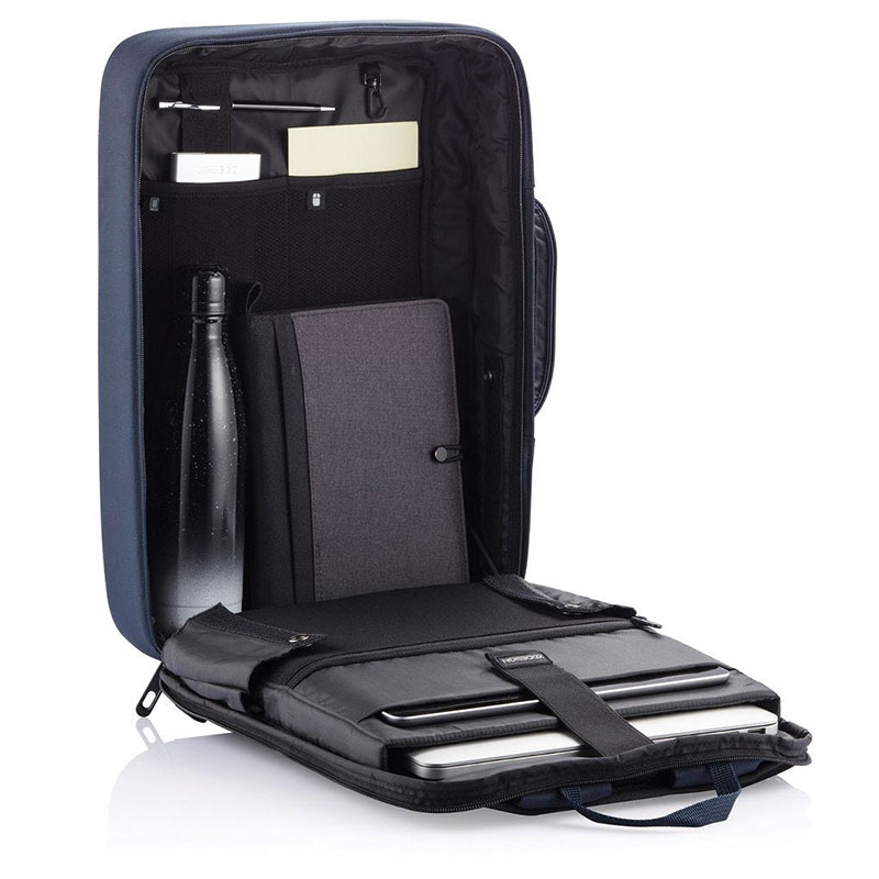 Конструкция Bobby Bizz позволяет открывать его под тремя разными углами: 30°, 90°, 180°. Для легкого и быстрого доступа, например, к блокноту или планшету, вполне достаточно открыть рюкзак под углом в 30°, удерживая его за верхнюю ручку. Полностью расстегнув молнию, вы сможете открыть рюкзак на все 90°, чтобы достать необходимые для работы или тренировки вещи. Если же вы хотите задействовать все пространство Bobby Bizz, то просто положите его на стол и раскройте как чемодан на все 180°.
