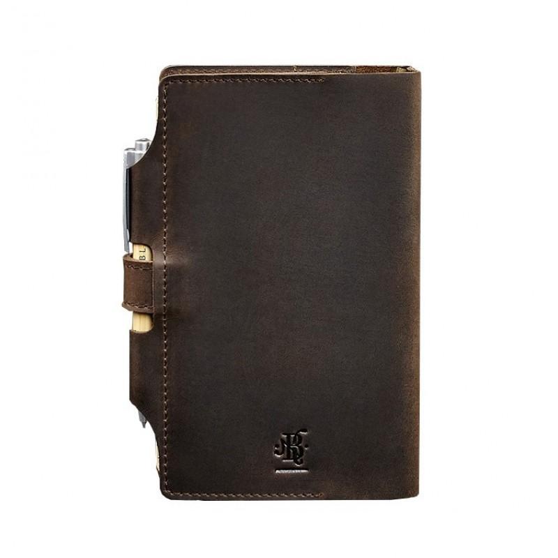 Этот блокнот исполнен в интересном форм-факторе: не классический книжный переплет, а, так называемый "софт-бук", т.е. прикрепленные к цельному куску кожи несколько тетрадей. В качестве обложки - высококачественная кожа. Внутри - классический блокнот, разделенный на три съемные тетради. В каждой тетрадке - по 40 листов. Вы сами можете выбрать цвет бумаги тетрадей.