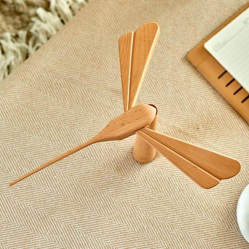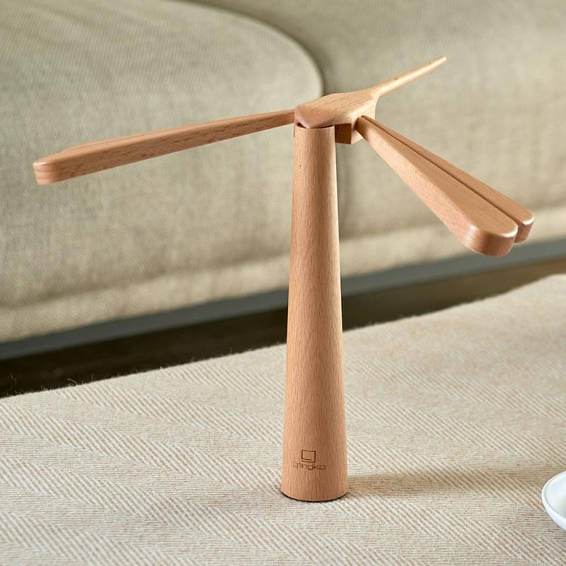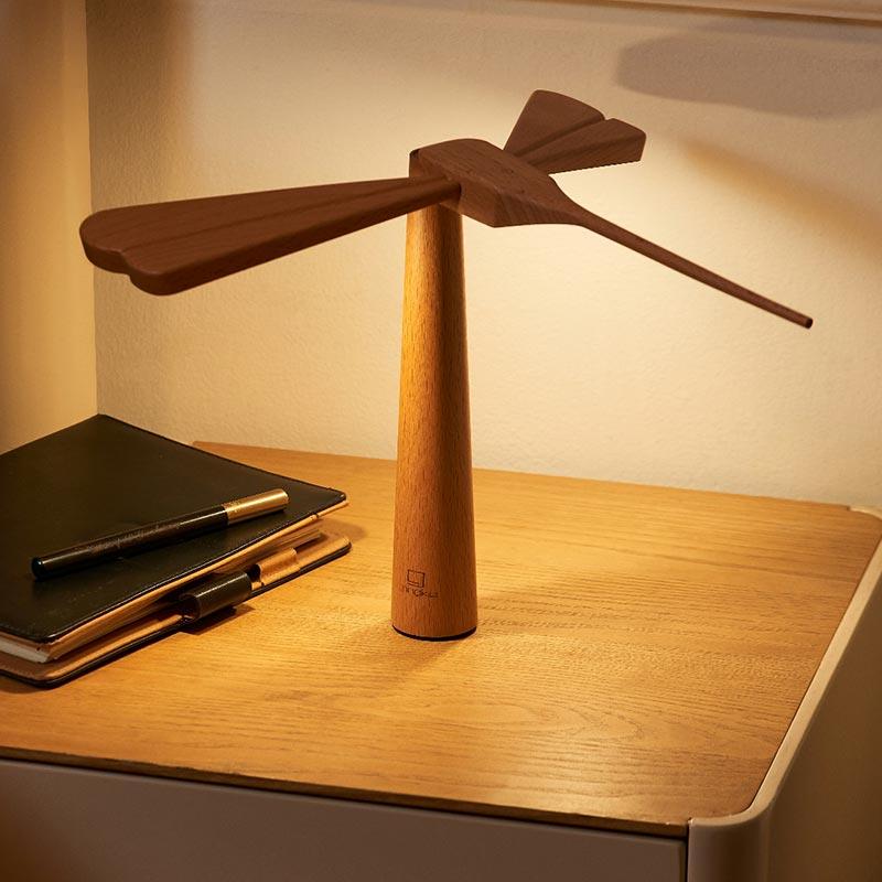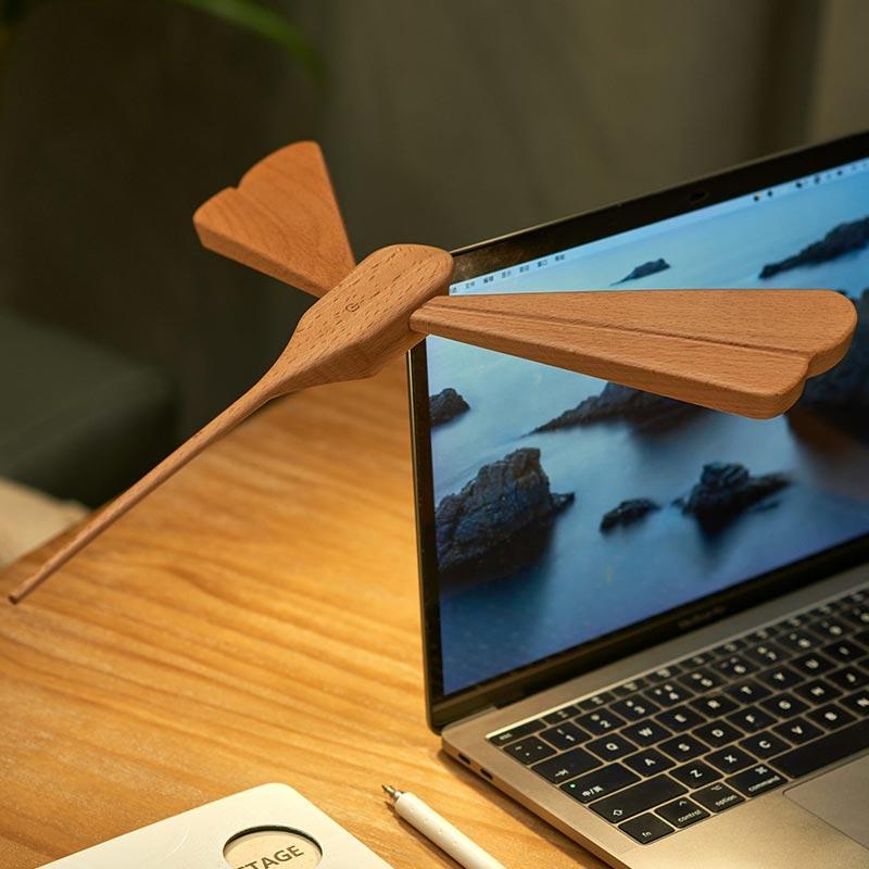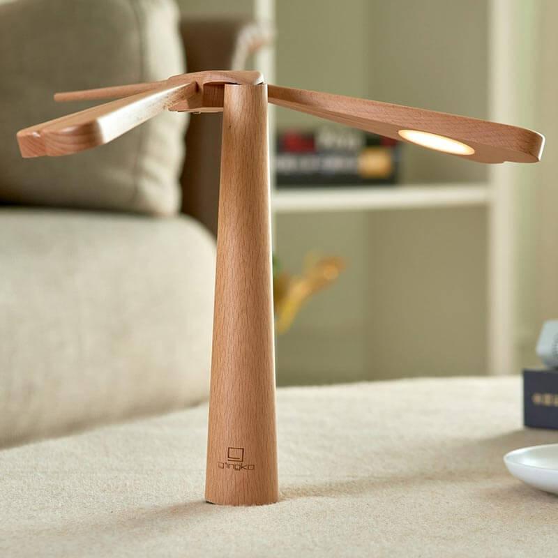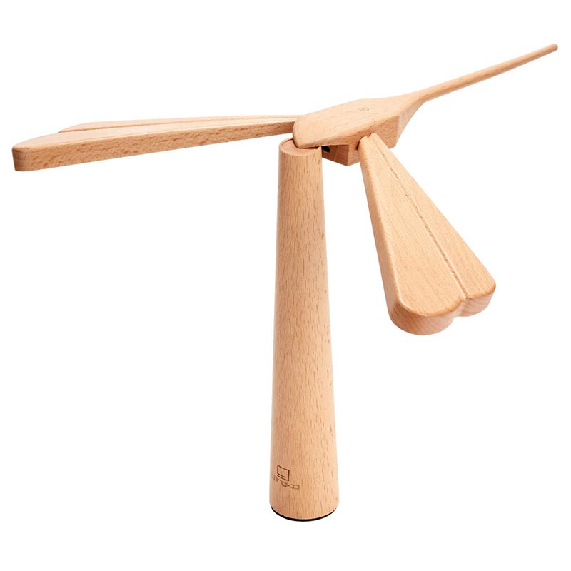 Светильник из натурального дерева в форме стрекозы со светодиодной подсветкой, спрятанной под крыльями, прекрасно балансирует на простой цилиндрической основе, входящей в комплект, или же на любой другой жесткой поверхности, такой как край стола, компьютерный монитор или даже ваша рука.