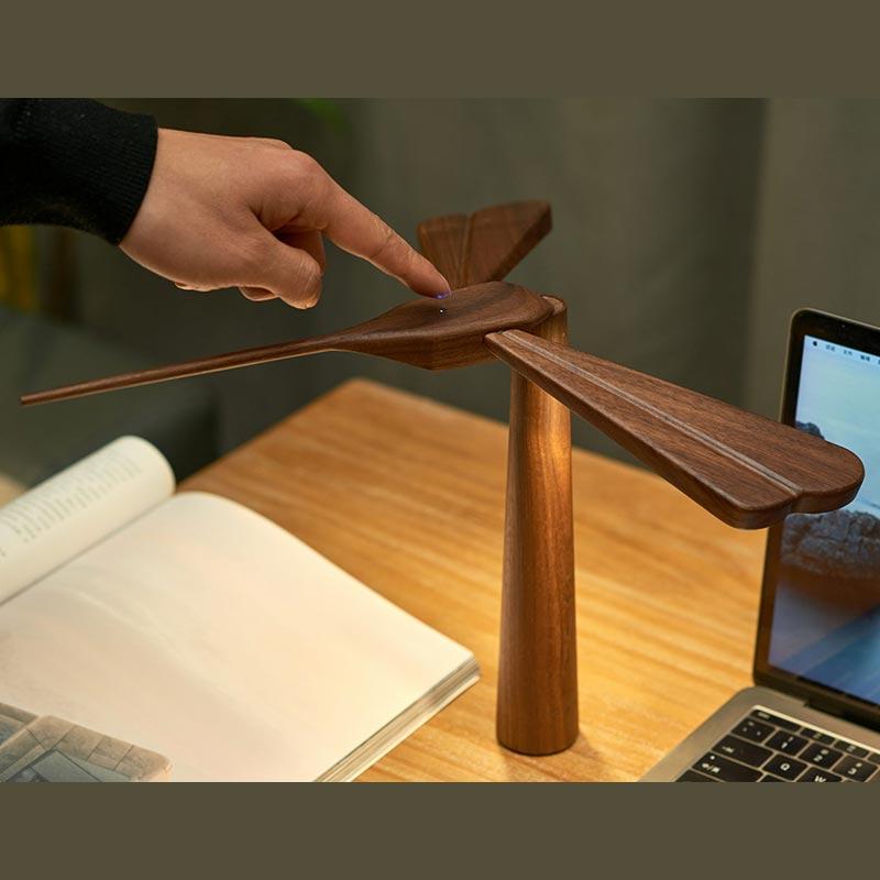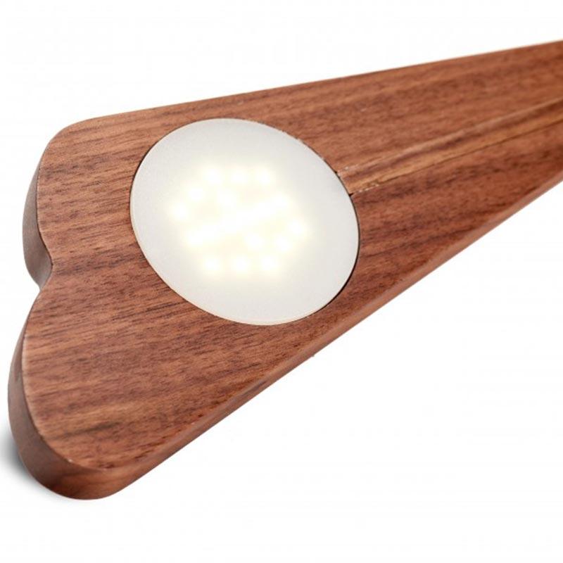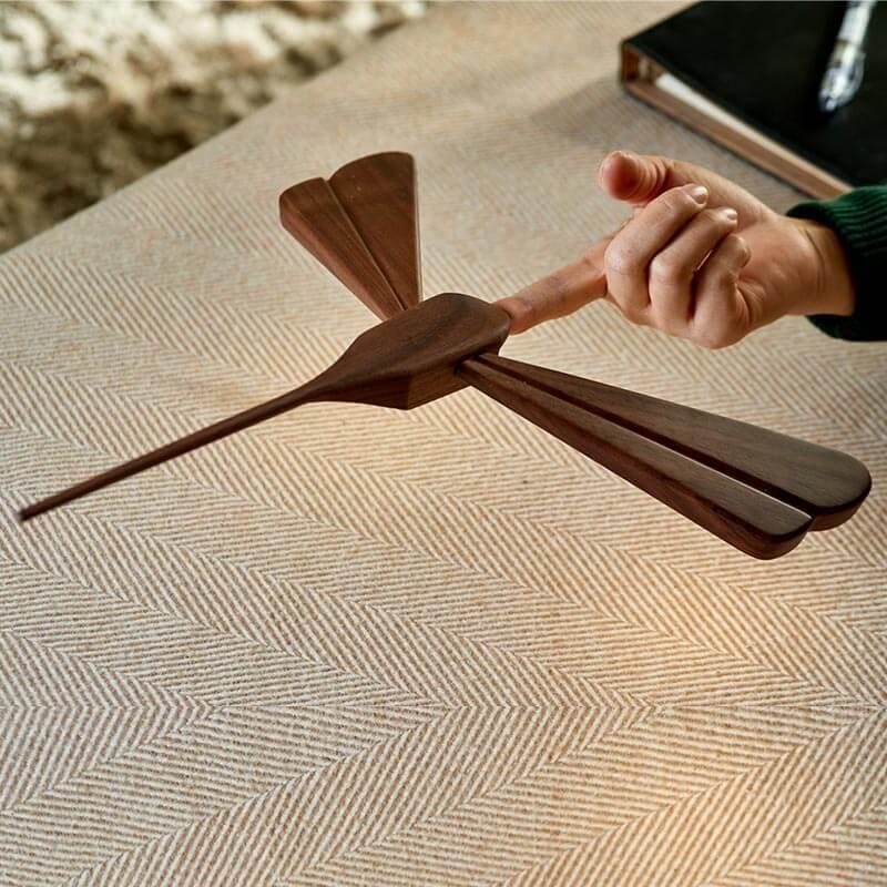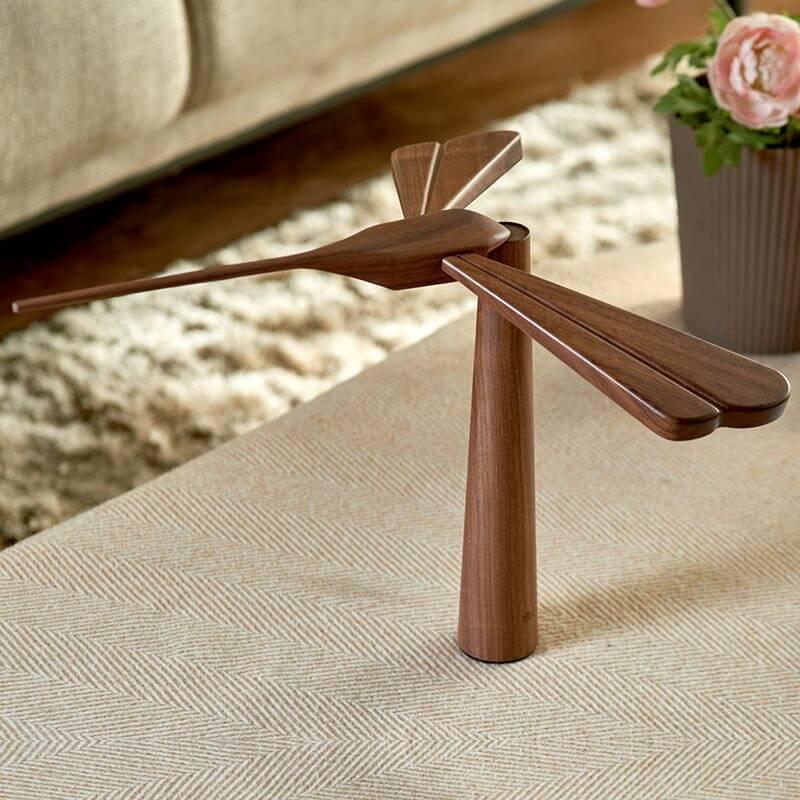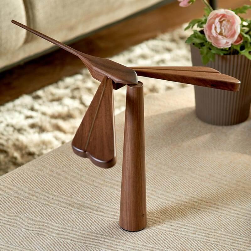 Светильник из натурального дерева в форме стрекозы со светодиодной подсветкой, спрятанной под крыльями, прекрасно балансирует на простой цилиндрической основе, входящей в комплект, или же на любой другой жесткой поверхности, такой как край стола, компьютерный монитор или даже ваша рука.