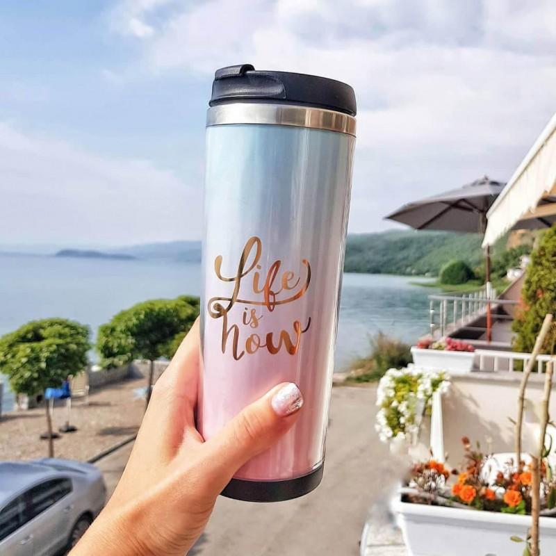Зачем? Не успеваете заметить, как остыл Ваш чай? Термокружка сохранит тепло и поможет замечать только наслаждение от напитка! Когда? Всегда, если нужно долго насладиться горячим кофе или чаем, а так же в летнюю жару попивать холодный коктейльчик. Где? На столе за компьютером или книгой, в подстаканнике машины, в кино вместе с попкорном, на прогулке с собакой, на улице с коляской, на велосипеде, на лыжах в горах,в походе у костра, на паре.