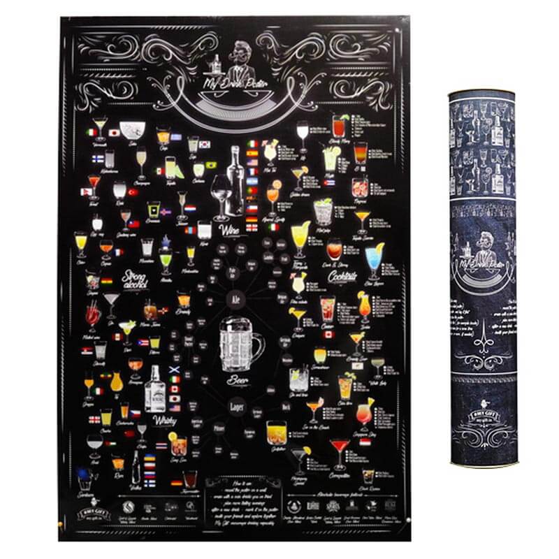 My Drink Poster - це особливий постер з усіма вашими улюбленими коктейлями, винами, пивом, віскі... Постер містить більше 120 різних видів алкогольних напоїв! Це прекрасний подарунок для будь-якого друга, батька або навіть колеги!