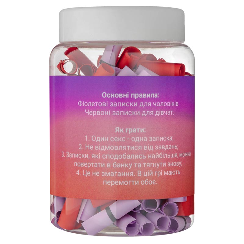 Як використовувати? Є два види записок: червоні – завдання для дівчат, фіолетові – для чоловіків. Кожен раз перед сексом вам потрібно витягнути одне завдання, виконати його та поділитись один з одним думкою про нього. Завдання бувають різні як за складністю, так і за напрямом.