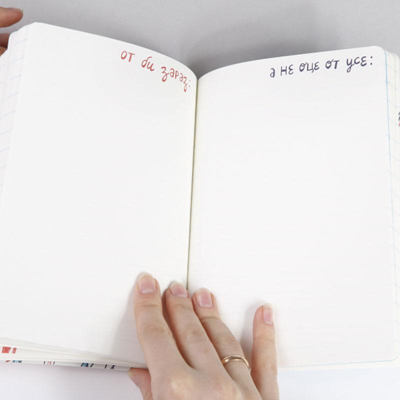 Відмінною особливістю цього блокноту є відсутність у ньому табличок, днів, дат, віконець - тобто будь-яких рамок, які будуть обмежувати і погляд, і свідомість.