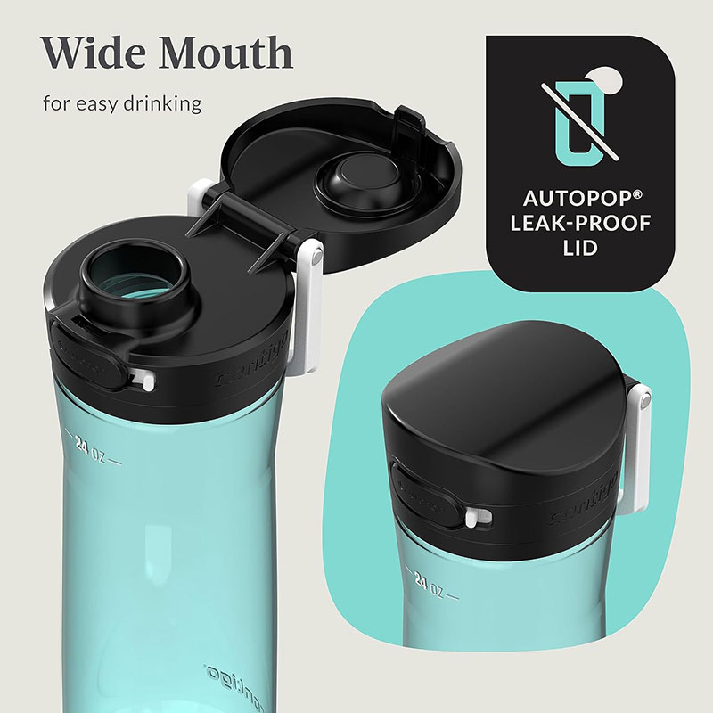 Коли ви закінчите пити, просто зафіксуйте кришку на місце, щоб повністю закрити її та захистити від протікання та бруду. Пляшка для води Contigo AUTOPOP™ герметична та оснащена замком-кнопкою для запобігання випадковому проливанню. Ця пляшка для води, що на 100 % не містить бісфенолу-А, має зручну ручку для перенесення та захисну кришку для захисту від бруду.