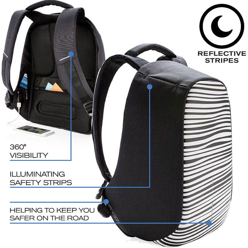 На рюкзаках Bobby є три групи світловідбиваючих елементів: смуга на передній стінці, по дві смужки на кожній лямці і тканина, що відбиває світло, в кутах вгорі рюкзака.