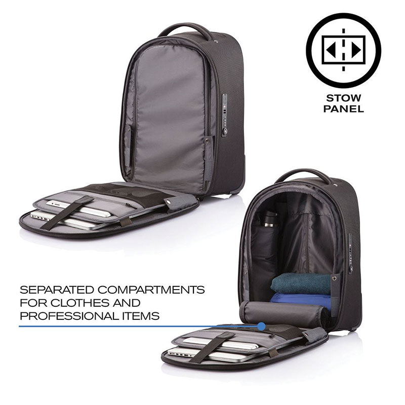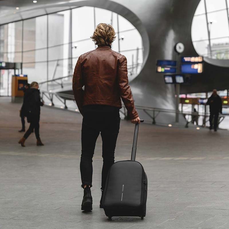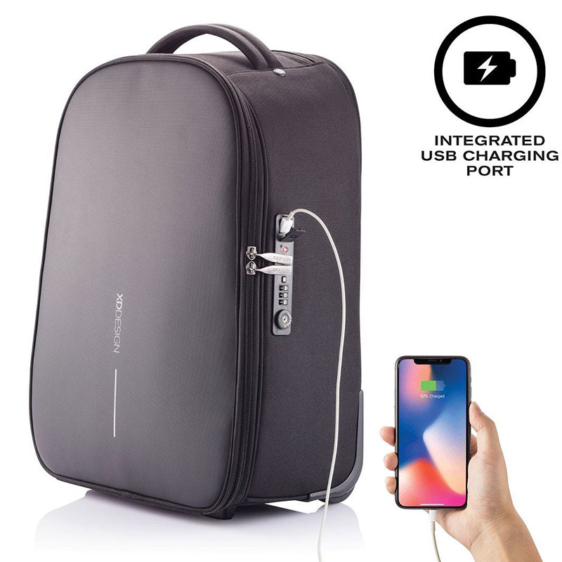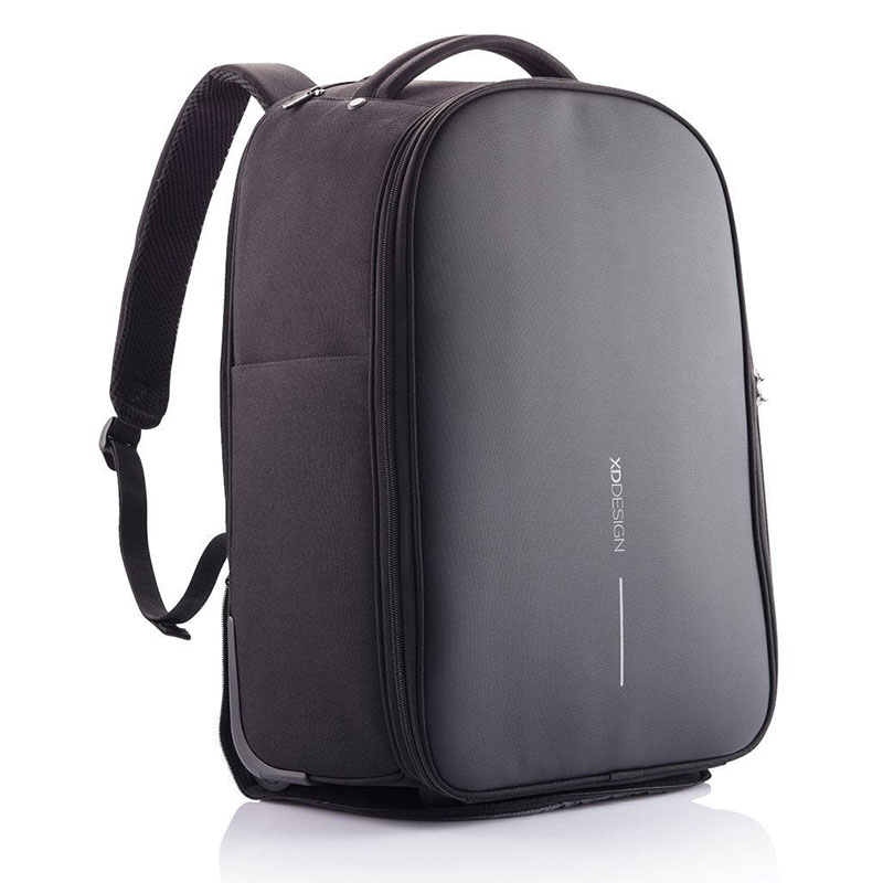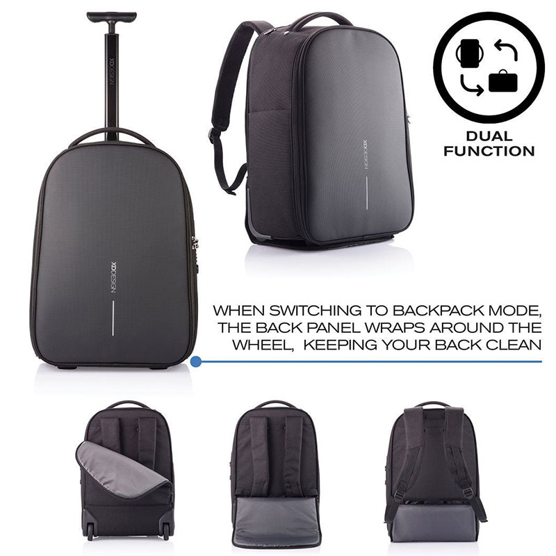 Щоб носити Bobby Trolley як рюкзак, достатньо прибрати ручку і закрити колеса спеціальним чохлом, що унеможливить забруднення. Рюкзак на колесах Bobby Trolley повторює знаменитий дизайн лінійки XD Design, оснащений вбудованим USB-портом для заряджання та замком TSA®. Усередині передбачені відсіки для одягу та робочого приладдя, є кишеня для ноутбука зі швидким доступом (відкривається під кутом 30 градусів та вміщує пристрої з діагоналлю до 17”). Також у рюкзаку на колесах передбачена кишеня для пляшок та кишеня з RFID-захистом. Bobby виготовлений з перероблених матеріалів, може використовуватися як ручна поклажа.