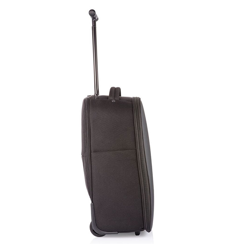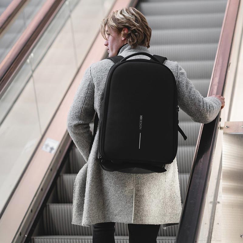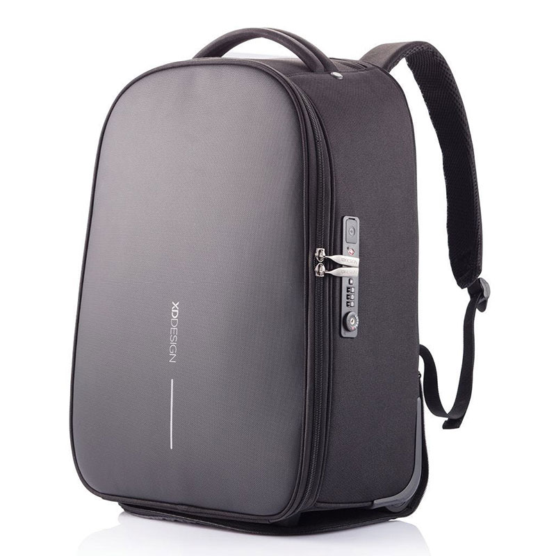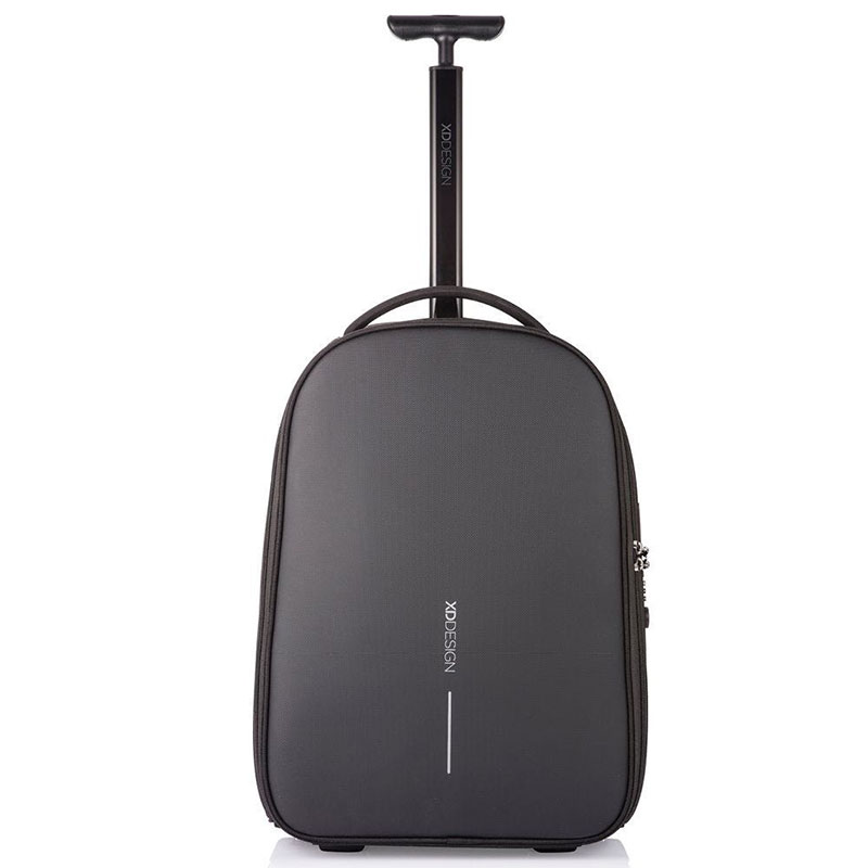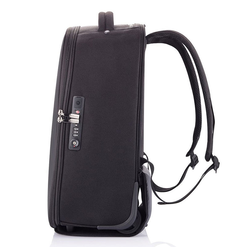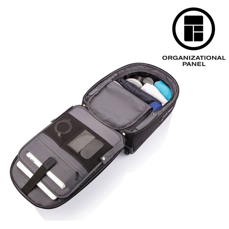 Щоб носити Bobby Trolley як рюкзак, достатньо прибрати ручку і закрити колеса спеціальним чохлом, що унеможливить забруднення. Рюкзак на колесах Bobby Trolley повторює знаменитий дизайн лінійки XD Design, оснащений вбудованим USB-портом для заряджання та замком TSA®. Усередині передбачені відсіки для одягу та робочого приладдя, є кишеня для ноутбука зі швидким доступом (відкривається під кутом 30 градусів та вміщує пристрої з діагоналлю до 17”). Також у рюкзаку на колесах передбачена кишеня для пляшок та кишеня з RFID-захистом. Bobby виготовлений з перероблених матеріалів, може використовуватися як ручна поклажа.