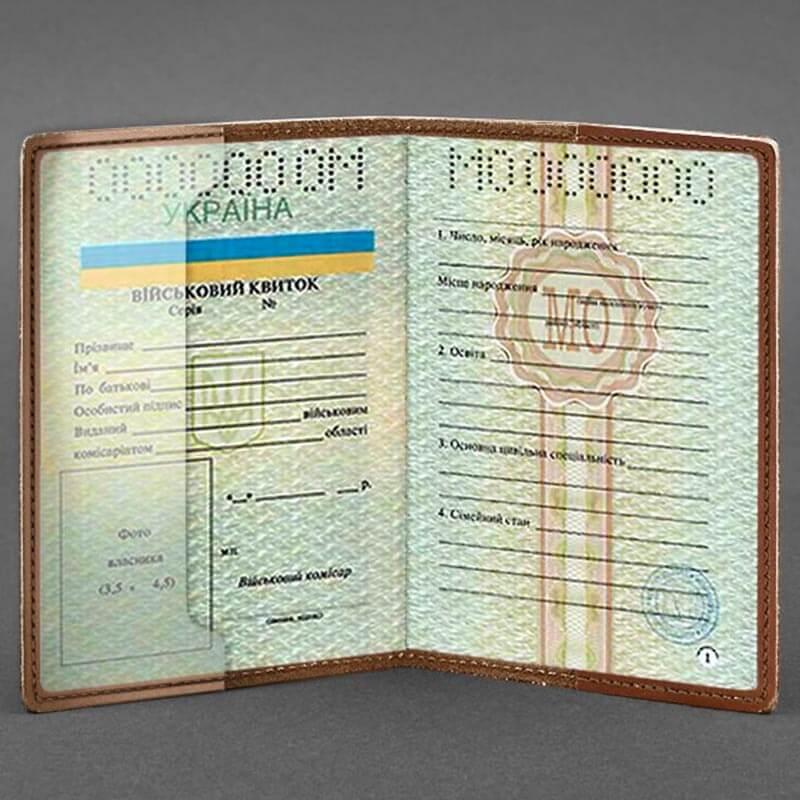 Усередині два відсіки для зручного розташування документа. Обкладинка з прозорою внутрішньою кишенею дозволяє розташувати військовий квиток у розгорнутому вигляді та демонструвати документ, не дістаючи його з обкладинки.