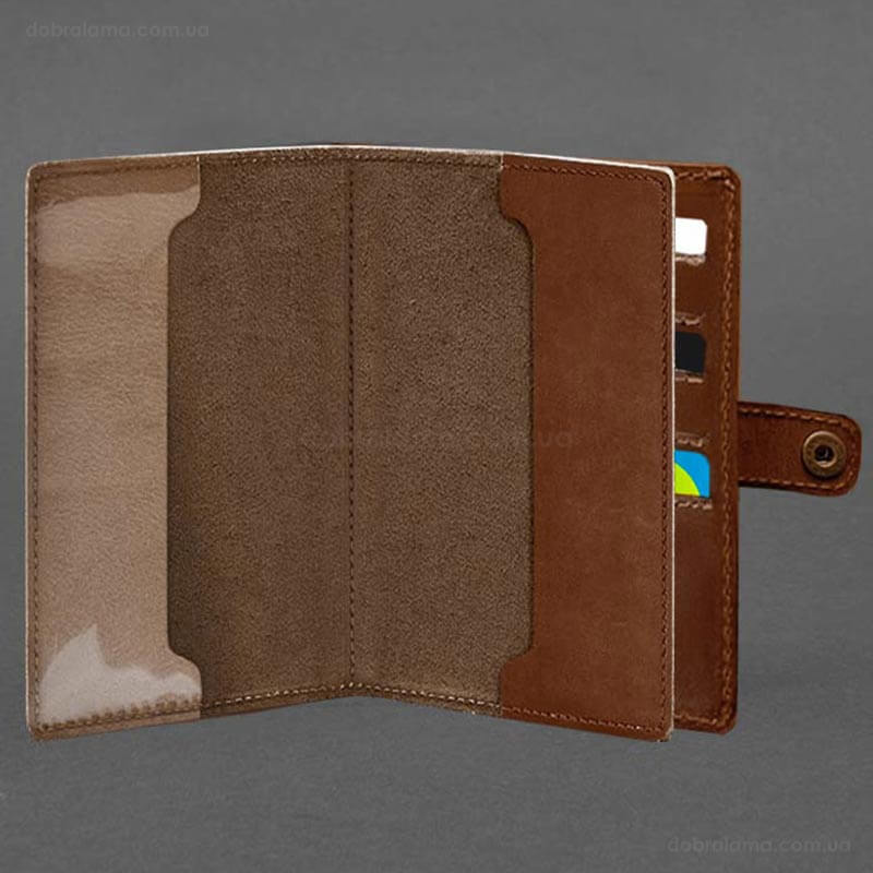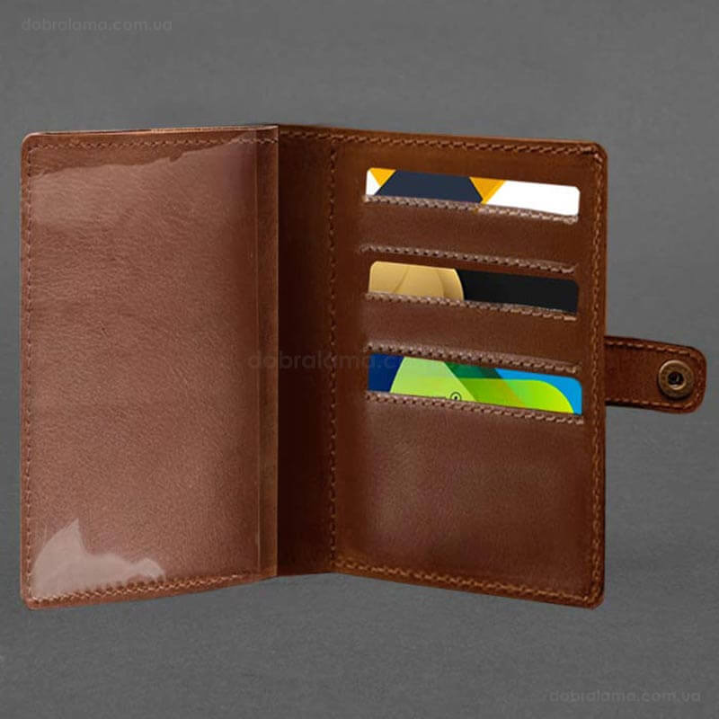 Усередині є 1 відділення для купюр, 5 слотів для пластикових карток, відділення з прозорою кишенею та відділення для документа.