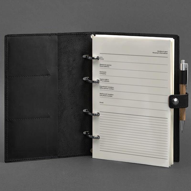 Механізм у блокноті міцний, металевий, кільця легко відкриваються, при цьому надійно фіксують внутрішні сторінки. Усередині змінний блок паперу на 366 сторінок, на сторінках блоку є місця для самостійного внесення дат.