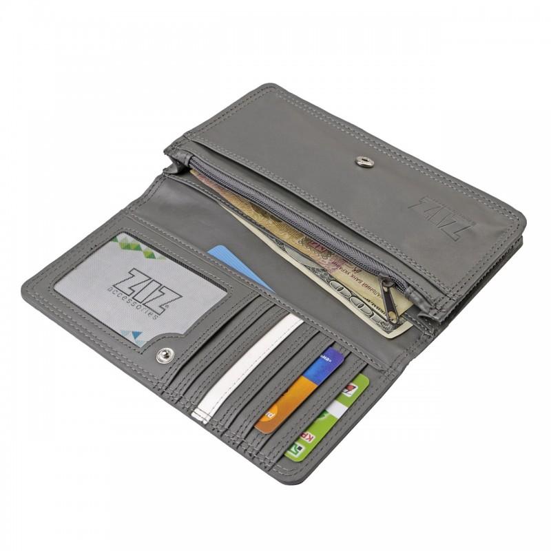 Гаманець має застібку-кнопку, з двома внутрішніми відділами для купюр, відділом для візиток, окремим відділом на блискавці для монет, 8 слотами для карток, а також зовнішнє відділення на блискавці.