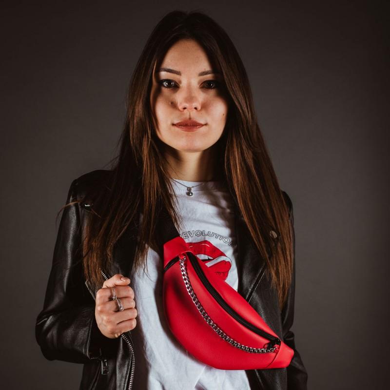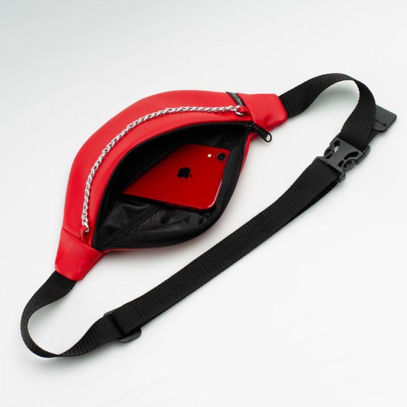 Поясна сумка-бананка червона шкіряна з ланцюжком