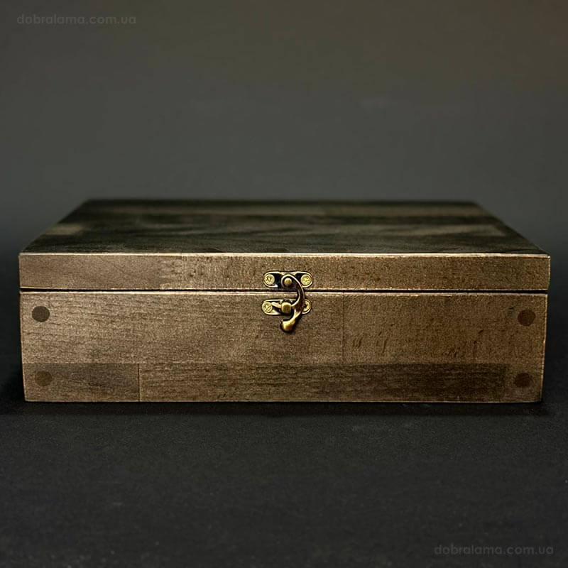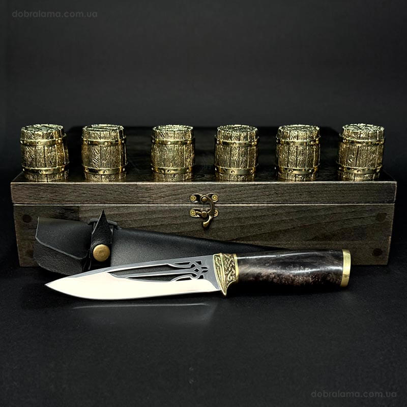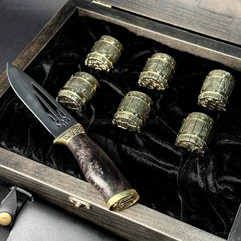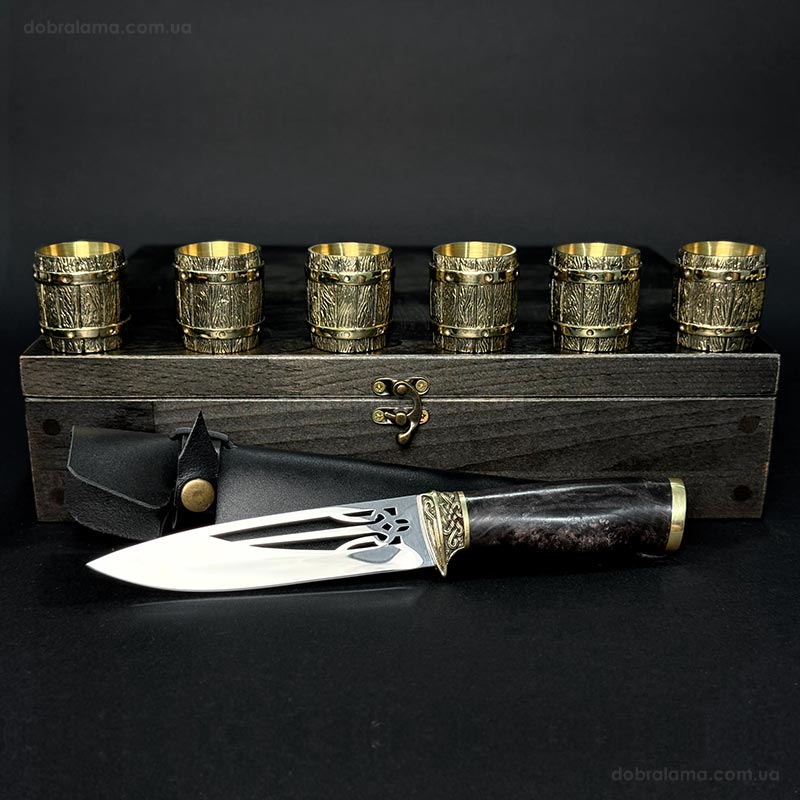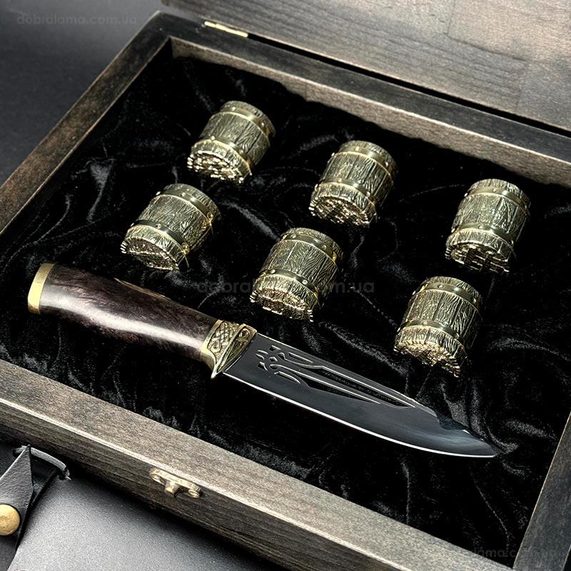 Подарунковий набір для чоловіків «Бочка» (6 бронзових чарок, ніж) в дерев'яному кейсі