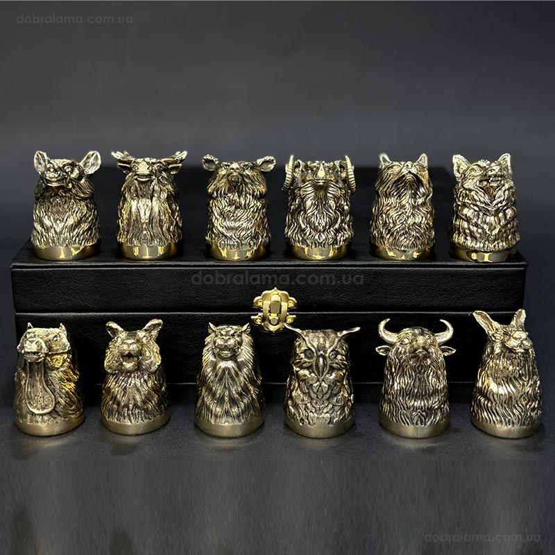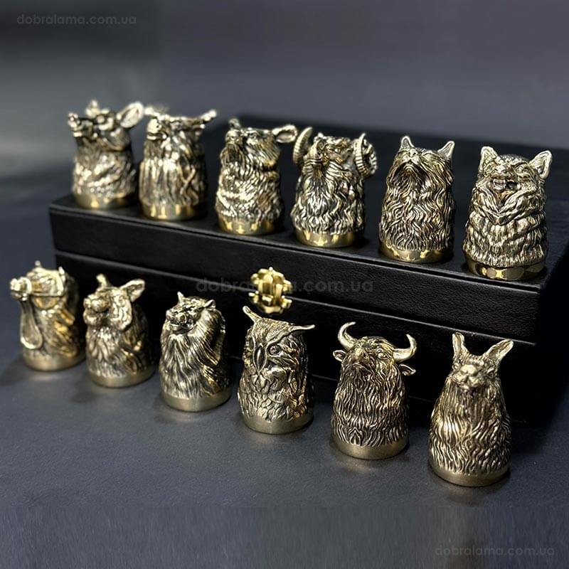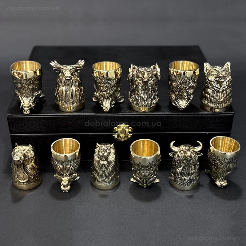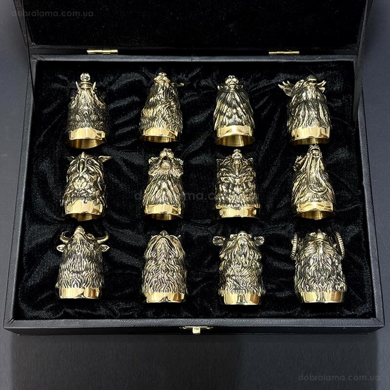 Набір бронзових чарок «Мисливські» (12 шт) в кейсі з екошкіри