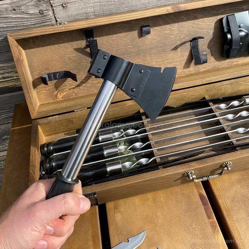 Подарунковий набір для шашлику «Лісник» складається з: 6-ти шампурів, 2-х підставок для шампурів (аналог мангалу), мультифункціональної лопати, топірця, ножа, пилки та брезентового чохла в подарунковому кейсі з натурального дерева.