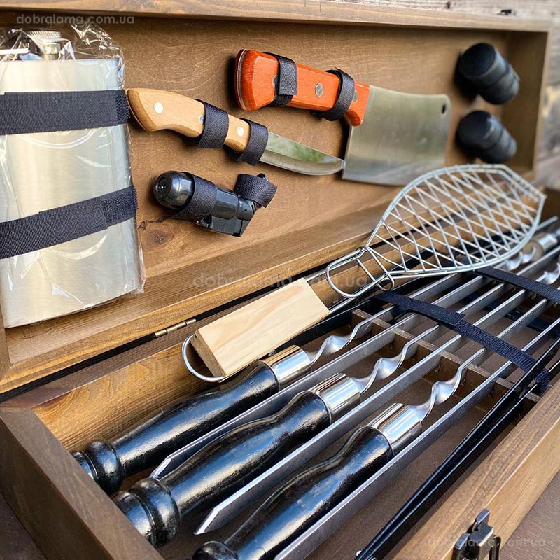 Подарунковий набір для шашлику «Майстер BBQ» складається з: 6-ти шампурів, 2-х підставок для шампурів (аналог мангалу), 8 стопок, фляги, міні-решітки для риби, турбозапальнички, мисливського ножа та тесака в подарунковому кейсі з натурального дерева.