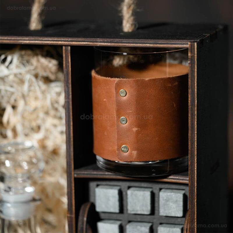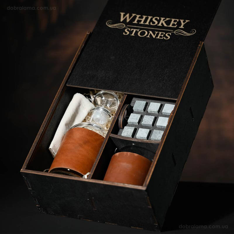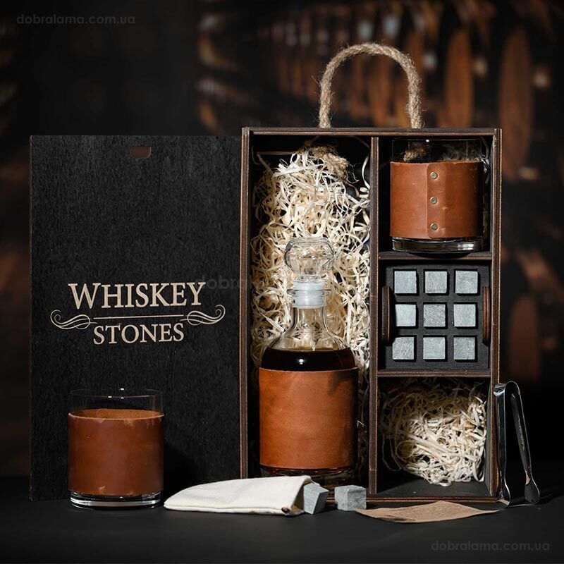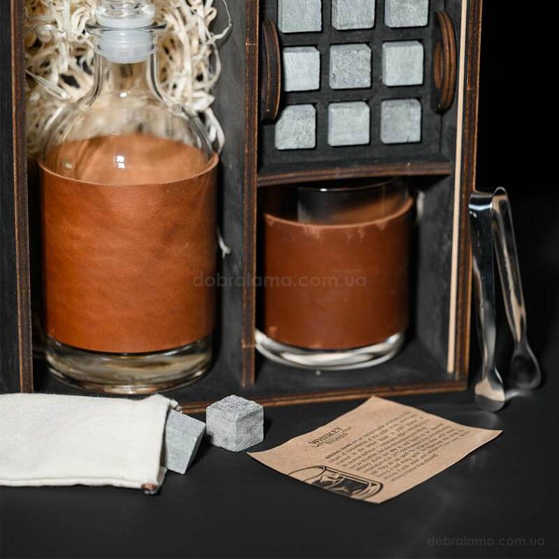 Набір для віскі, що складається з 2-х склянок та графіну для віскі в шкіряному футлярі в комплекті з каменями, що охолоджують, щипцями і мішечком для каменів, порадує будь-якого чоловіка.
