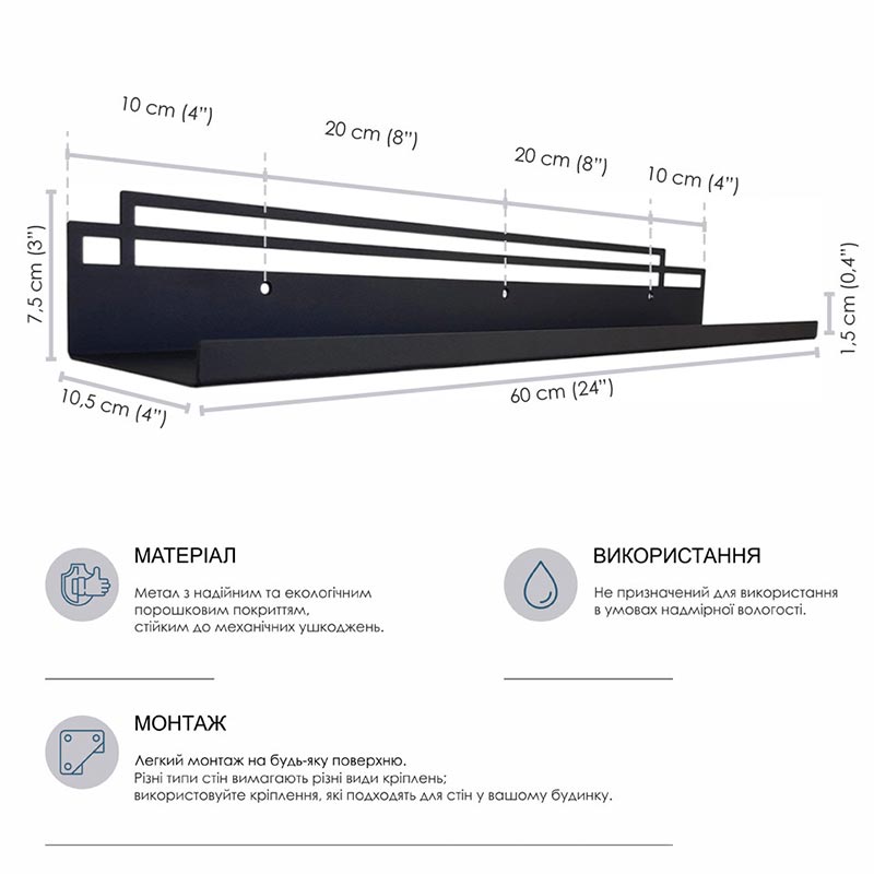 Настінна полиця Glozis Bau (чорна), 60 см
