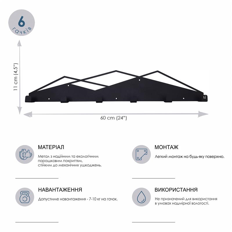 Настінна вішалка для одягу Glozis Mountain (чорна), 60х11 см