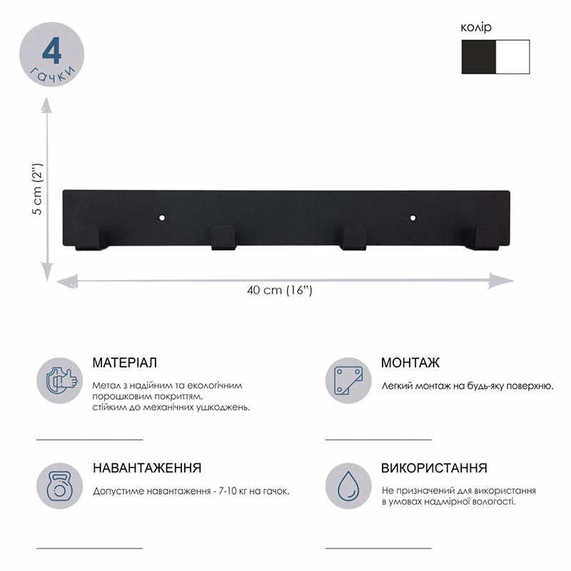 Настінна вішалка для одягу Glozis Urban 40 (чорна), 40х5 см