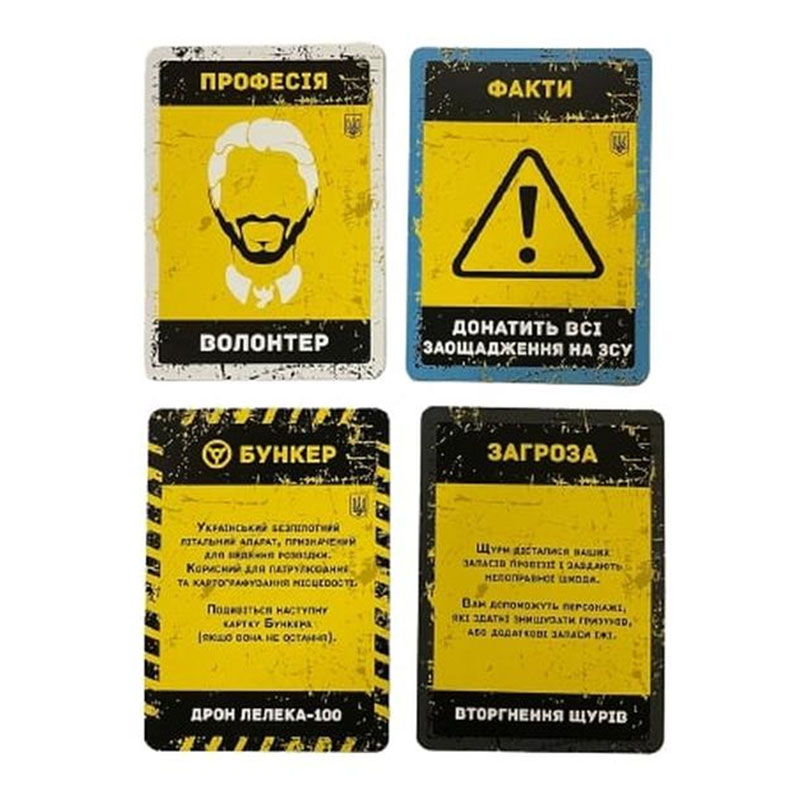 Гра Бункер буде починатися з однієї з цих катастроф. Відповідна картка обирається випадковим чином та задає настрій на всю партію. Художній вступ можна прочитати самостійно або ж поринути у атмосферу гри, прослухавши художнє озвучування з QR-коду на картці.