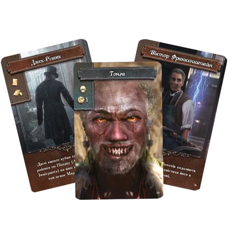 Одну з найважливіших ролей грають карти, вони пожвавлюють гру та включають більшість відомих персонажів із різних популярних творів. Такі персонажі, як Шерлок Холмс і Фейгін (з Олівера Твіста), включені до числа секретних особистостей, ролі яких гравці прийматимуть під час гри. Серед величезної стопки карт дій є багато знайомих імен, осіб та місць, які охоплюють багатьох авторів, багато з них вигадані й існують лише в популярних художніх книгах, але є й реальні персонажі тогочасних подій – наприклад, що стосуються Джека Потрошителя.